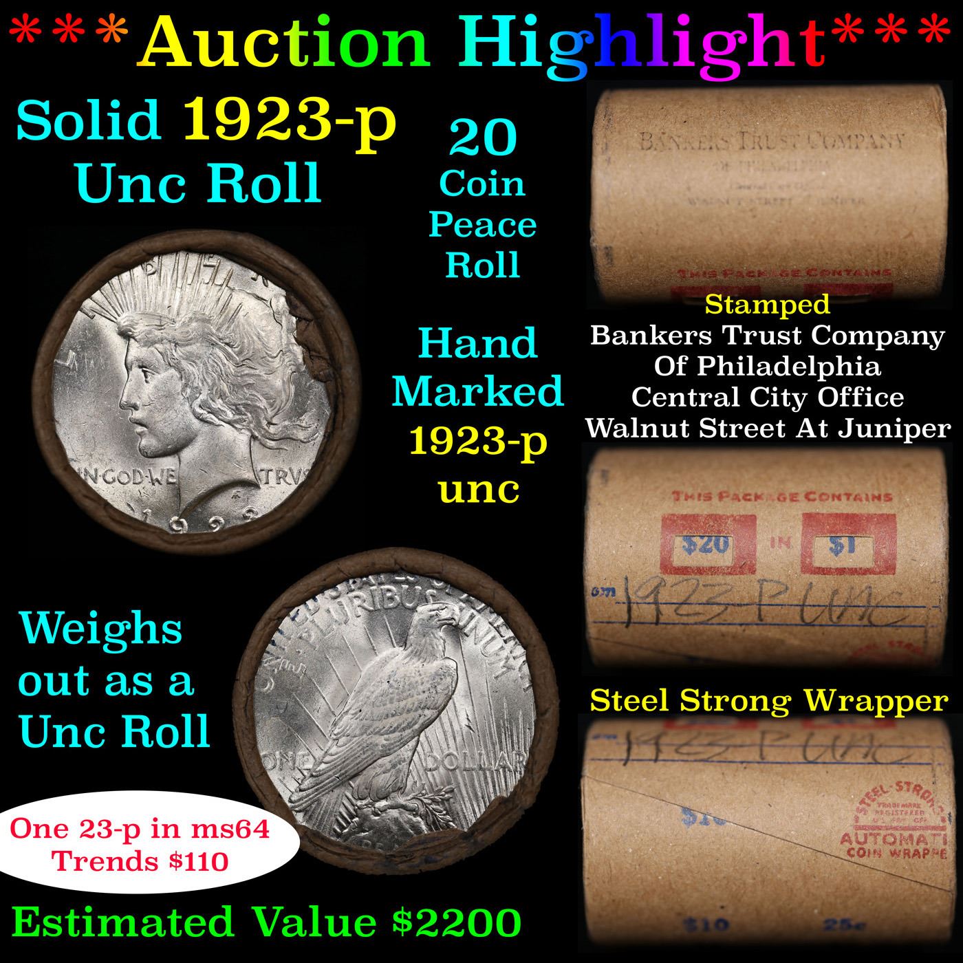 ***Auction Highlight*** Full solid date 1923-p Uncirculated Peace silver dollar roll, 20 coins. This roll is held in an old Steel strong wrapper, patented 1921, stamped "Bankers Trust Company of Philadelphia, Walnut Street at Juniper. 1923-p Uncirculated Peace Dollar Roll, Superb Ends. Weighs Perfectly as an Uncirculated Roll. Trends in ms64 is $110 and ms63 is $90. One ms66 is $475 and one ms65 is $185.