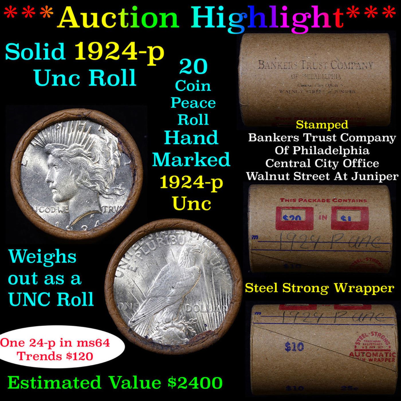 ***Auction Highlight*** Full solid date 1924-p Uncirculated Peace silver dollar roll, 20 coins. This roll is held in an old Steel strong wrapper, patented 1921, stamped "Bankers Trust Company of Philadelphia, Walnut Street at Juniper. 1924-p Uncirculated Peace Dollar Roll, Superb Ends. Weighs Perfectly as an Uncirculated Roll. Trends in ms64 is $110 and ms63 is $80. One ms66 is $625 and one ms65 is $240.