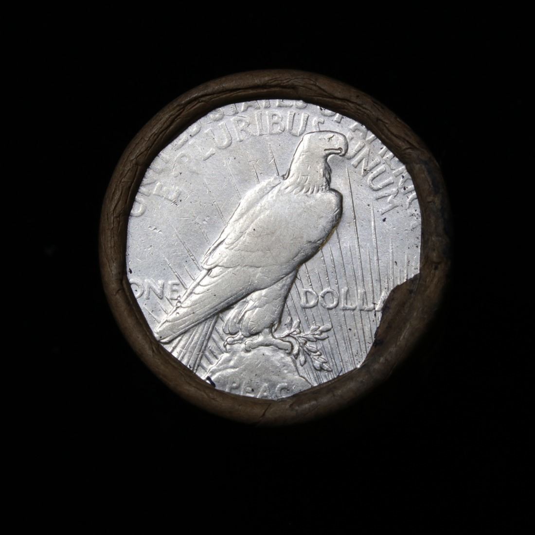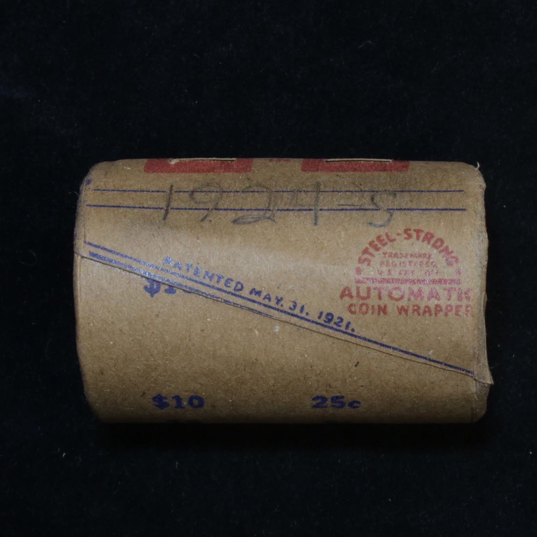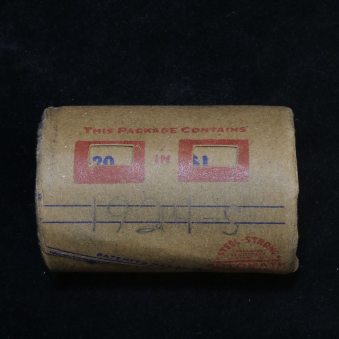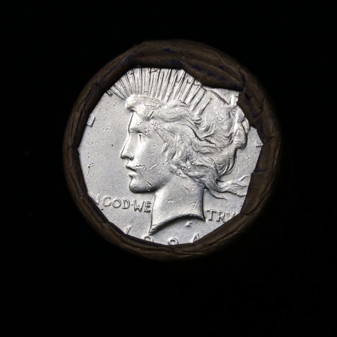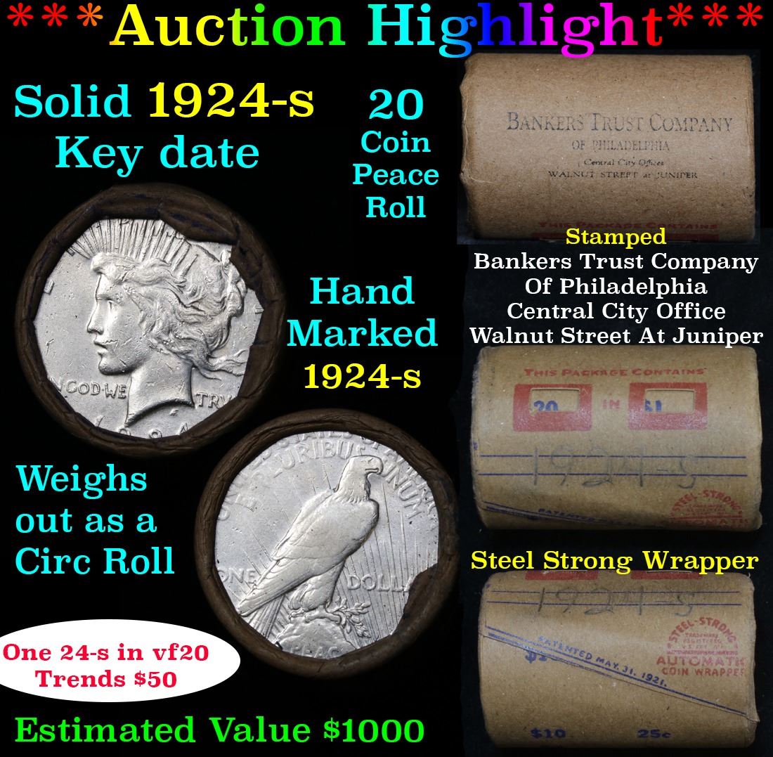 ***Auction Highlight*** Full solid date 1924-s Peace silver dollar roll, 20 coins . This roll is held in an old Steel strong wrapper, patented 1921, stamped "Bankers Trust Company of PhiladelphiaÓ, Walnut Street at Juniper. This roll contains 20, 1924-s Peace silver Dollars. The coins may range from circulated to uncirculated. Any condition is possible. We have weighed the roll and can assure you that it is 20 Silver Dollars, that all 20 are 1924-s and that it is not an uncirculated roll as the weight comes in slightly under the 534.60 grams that a fully uncirculated roll would weigh. We recently Acquired a large Estate Hoard of solid date Rolls. Trends lists au50 at $77, xf40 at $60, vf20 at $50, f12 at $43, and vg8 at $35, and g4 at $30.