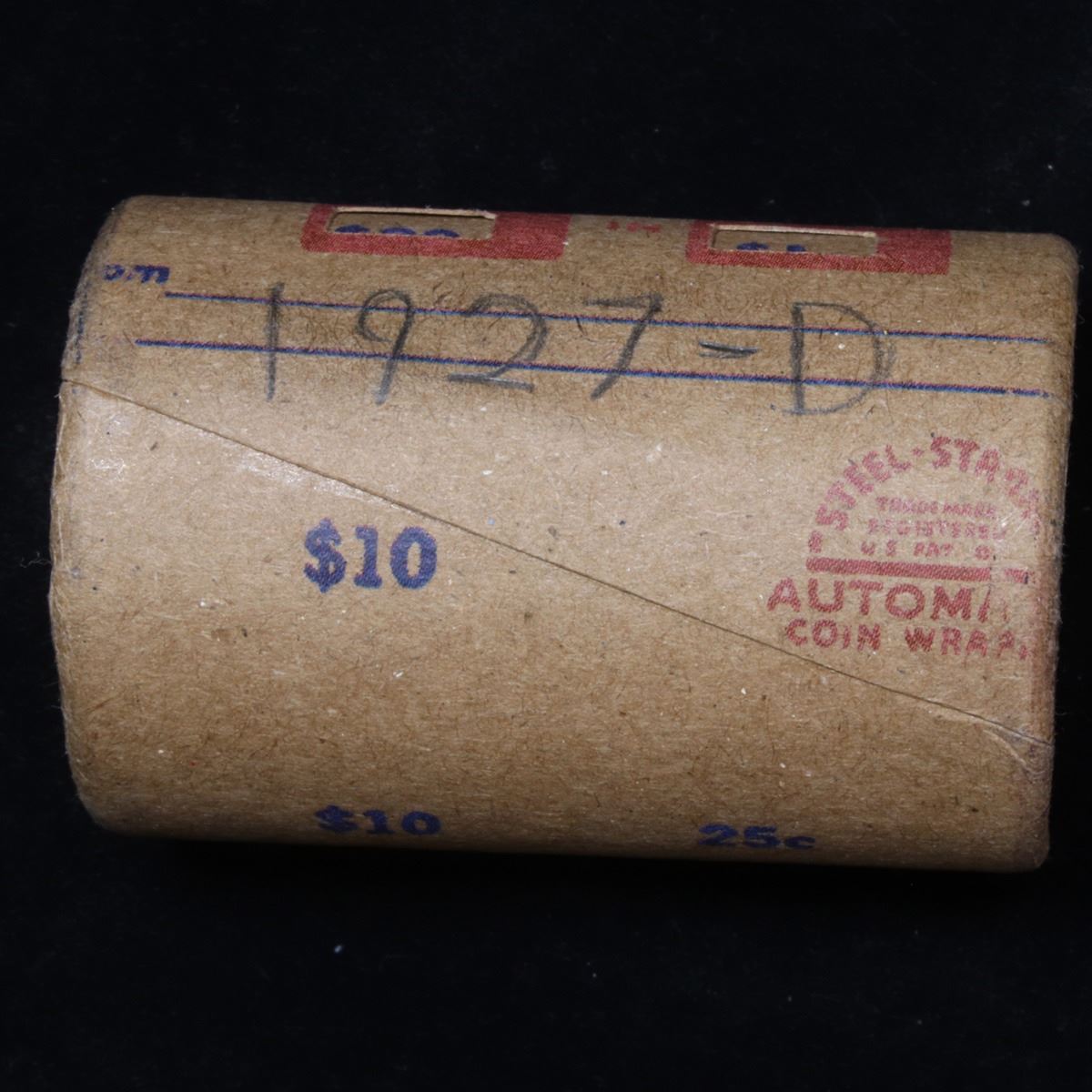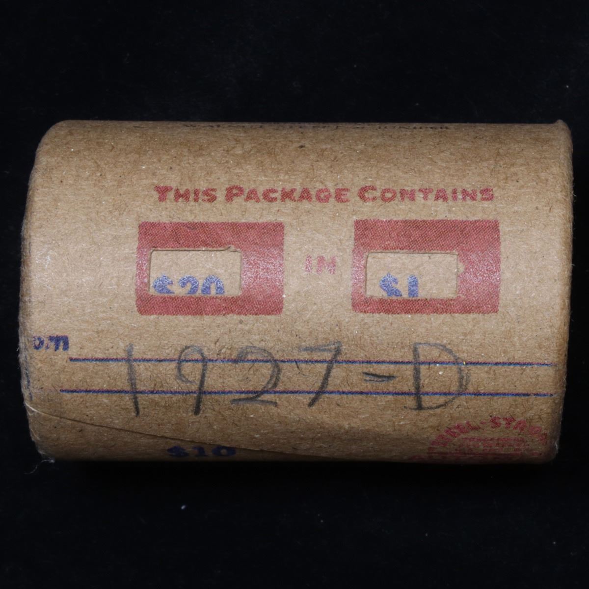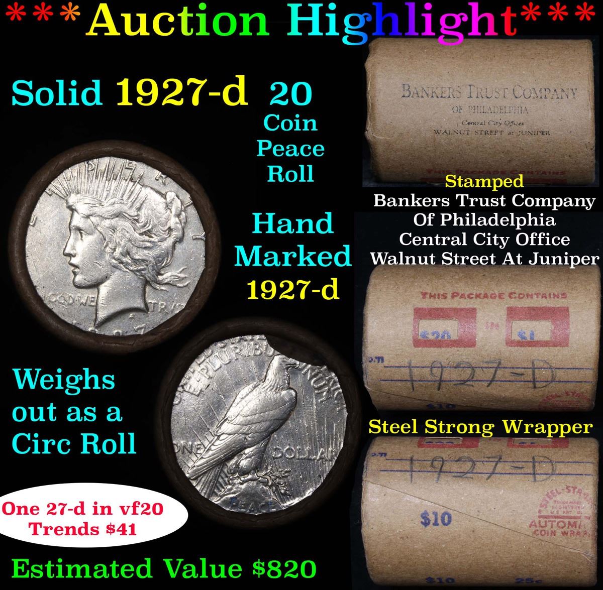 ***Auction Highlight*** Full solid date 1927-d Peace silver dollar roll, 20 coins. This roll is held in an old Steel strong wrapper, patented 1921, stamped "Bankers Trust Company of Philadelphia, Walnut Street at Juniper. This roll contains 20, 1927-d Peace silver Dollars. The coins may range from circulated to uncirculated. Any condition is possible. We have weighed the roll and can assure you that it is 20 Silver Dollars, that all 20 are 1927-d and that it is not an uncirculated roll as the weight comes in slightly under the 534.60 grams that a fully uncirculated roll would weigh. We recently Acquired a large Estate Hoard of solid date Rolls. Trends lists au50 at $87, xf40 at $55, vf20 at $41, f12 at $37, vg8 at $32, g4 at $32.