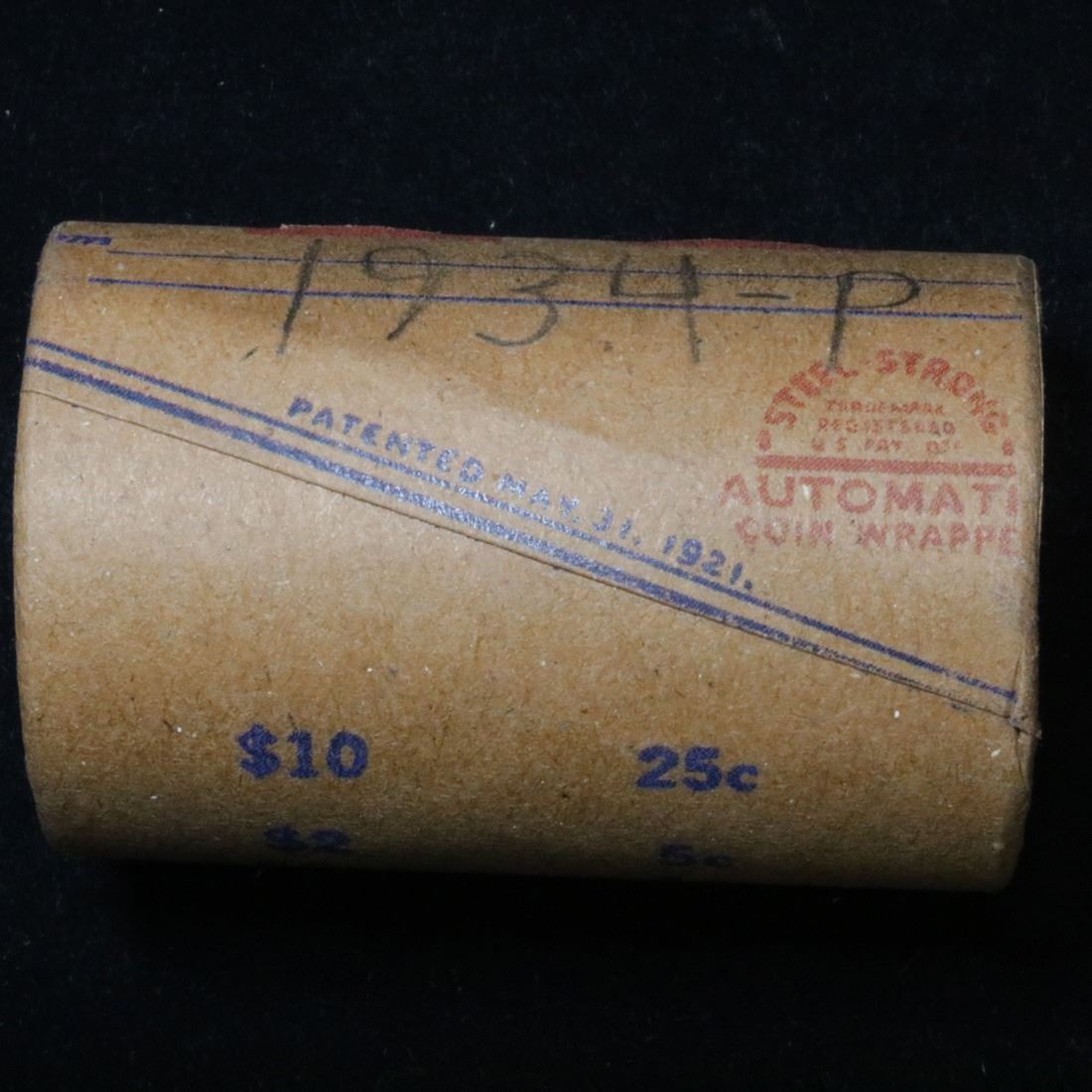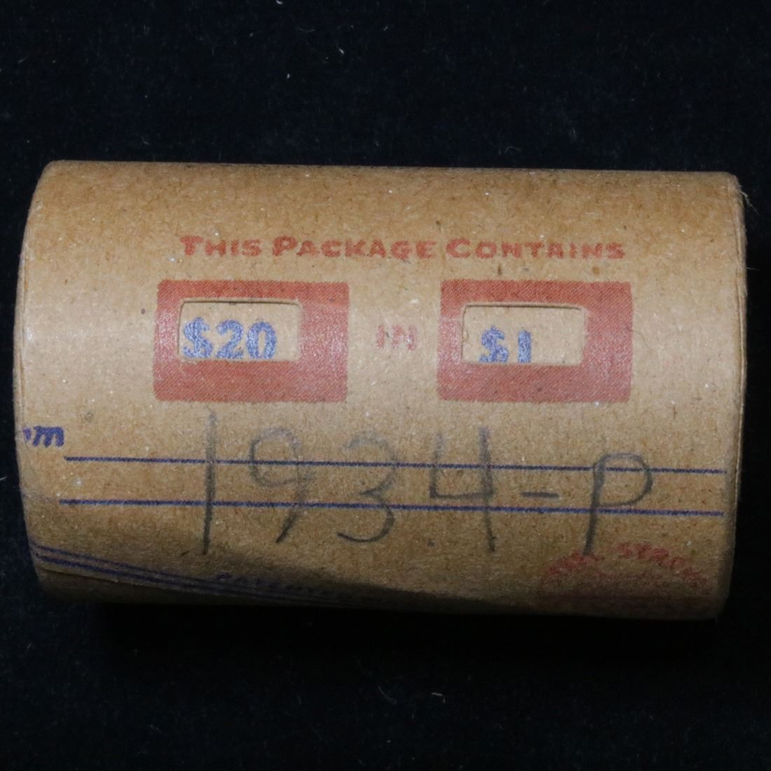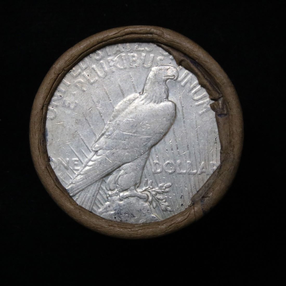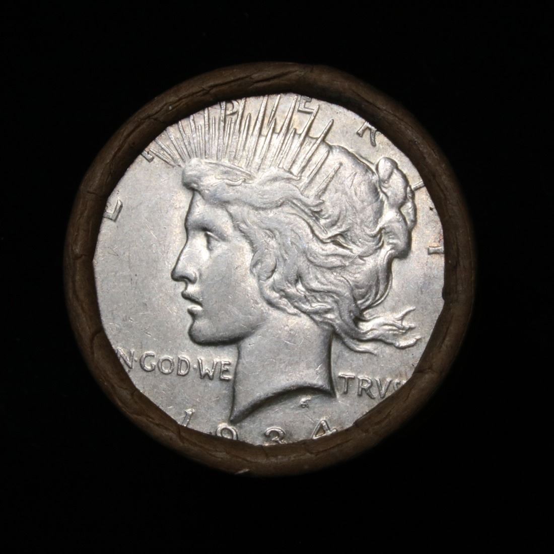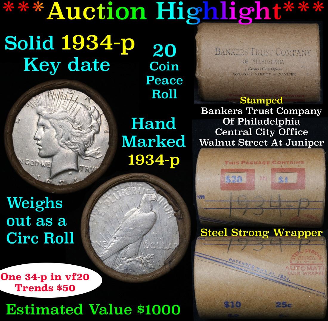 ***Auction Highlight*** Full solid date 1934-p Peace silver dollar roll, 20 coins . This roll is held in an old Steel strong wrapper, patented 1921, stamped "Bankers Trust Company of PhiladelphiaÓ, Walnut Street at Juniper. This roll contains 20, 1934-p Peace silver Dollars. The coins may range from circulated to uncirculated. Any condition is possible. We have weighed the roll and can assure you that it is 20 Silver Dollars, that all 20 are 1934-p and that it is not an uncirculated roll as the weight comes in slightly under the 534.60 grams that a fully uncirculated roll would weigh. We recently Acquired a large Estate Hoard of solid date Rolls. Trends lists au50 at $61, xf40 at $57, vf20 at $50, f12 at $45, vg8 at $42, and g4 at $40.