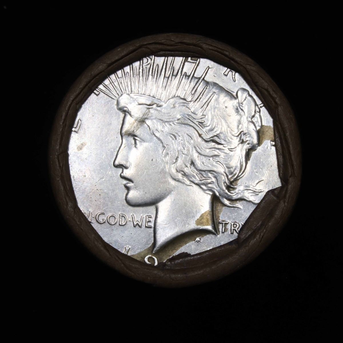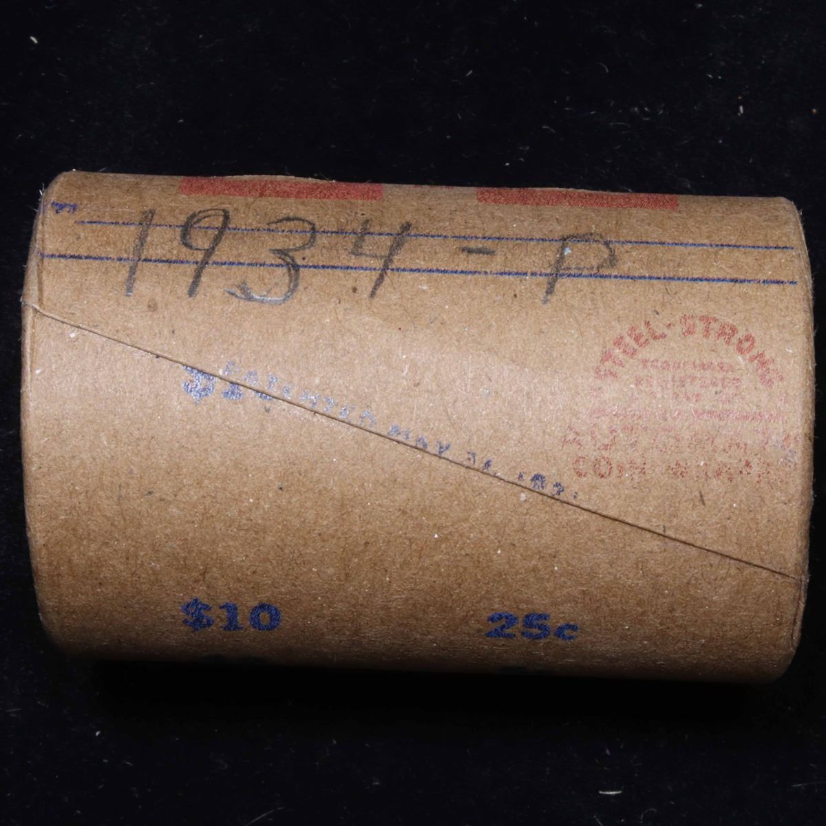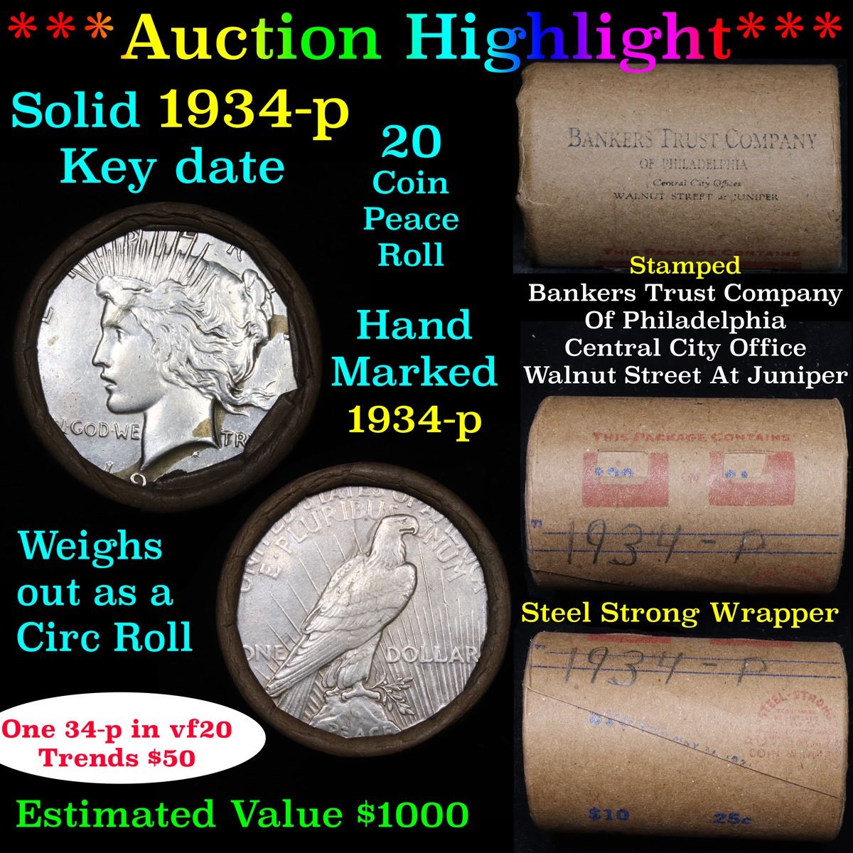 ***Auction Highlight*** Full solid date 1934-p Peace silver dollar roll, 20 coins. This roll is held in an old Steel strong wrapper, patented 1921, stamped "Bankers Trust Company of Philadelphia, Walnut Street at Juniper. This roll contains 20, 1934-p Peace silver Dollars. The coins may range from circulated to uncirculated. Any condition is possible. We have weighed the roll and can assure you that it is 20 Silver Dollars, that all 20 are 1934-p and that it is not an uncirculated roll as the weight comes in slightly under the 534.60 grams that a fully uncirculated roll would weigh. We recently Acquired a large Estate Hoard of solid date Rolls. Trends lists au50 at $61, xf40 at $57, vf20 at $50, f12 at $45, vg8 at $42, g4 at $40.