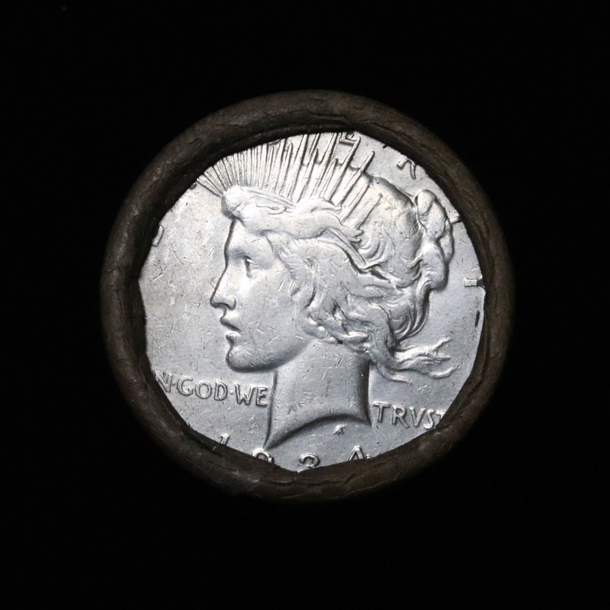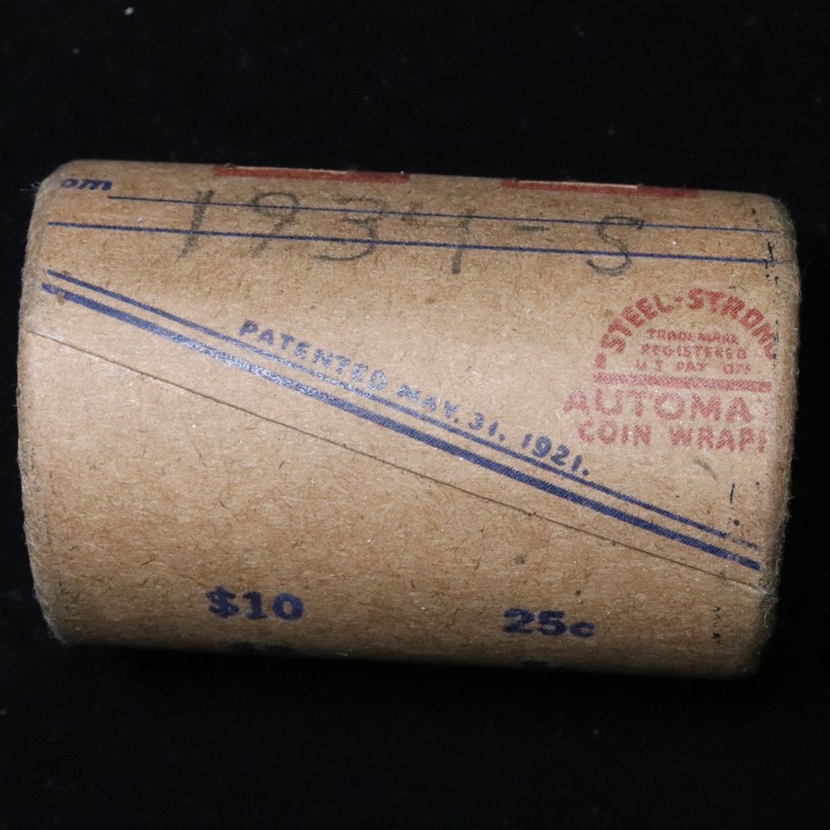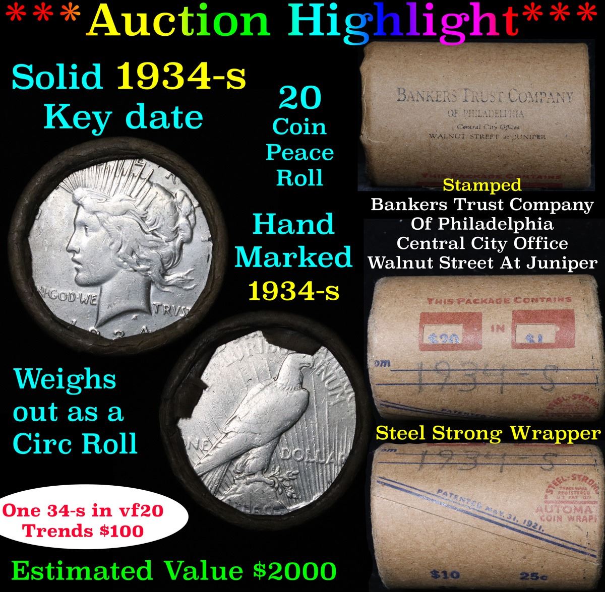 ***Auction Highlight*** Full solid date 1934-s Peace silver dollar roll, 20 coins . .. This roll is held in an old Steel strong wrapper, patented 1921, stamped "Bankers Trust Company of Philadelphia Walnut Street at Juniper. This roll contains 20, 1934-s Peace silver Dollars. The coins may range from circulated to uncirculated. Any condition is possible. We have weighed the roll and can assure you that it is 20 Silver Dollars, that all 20 are 1934-s and that it is not an uncirculated roll as the weight comes in slightly under the 534.60 grams that a fully uncirculated roll would weigh. We recently Acquired a large Estate Hoard of solid date Rolls. Trends lists au50 at $375, xf40 at $180, vf20 at $100, f12 at $65, vg8 at $50, g4 at $40.