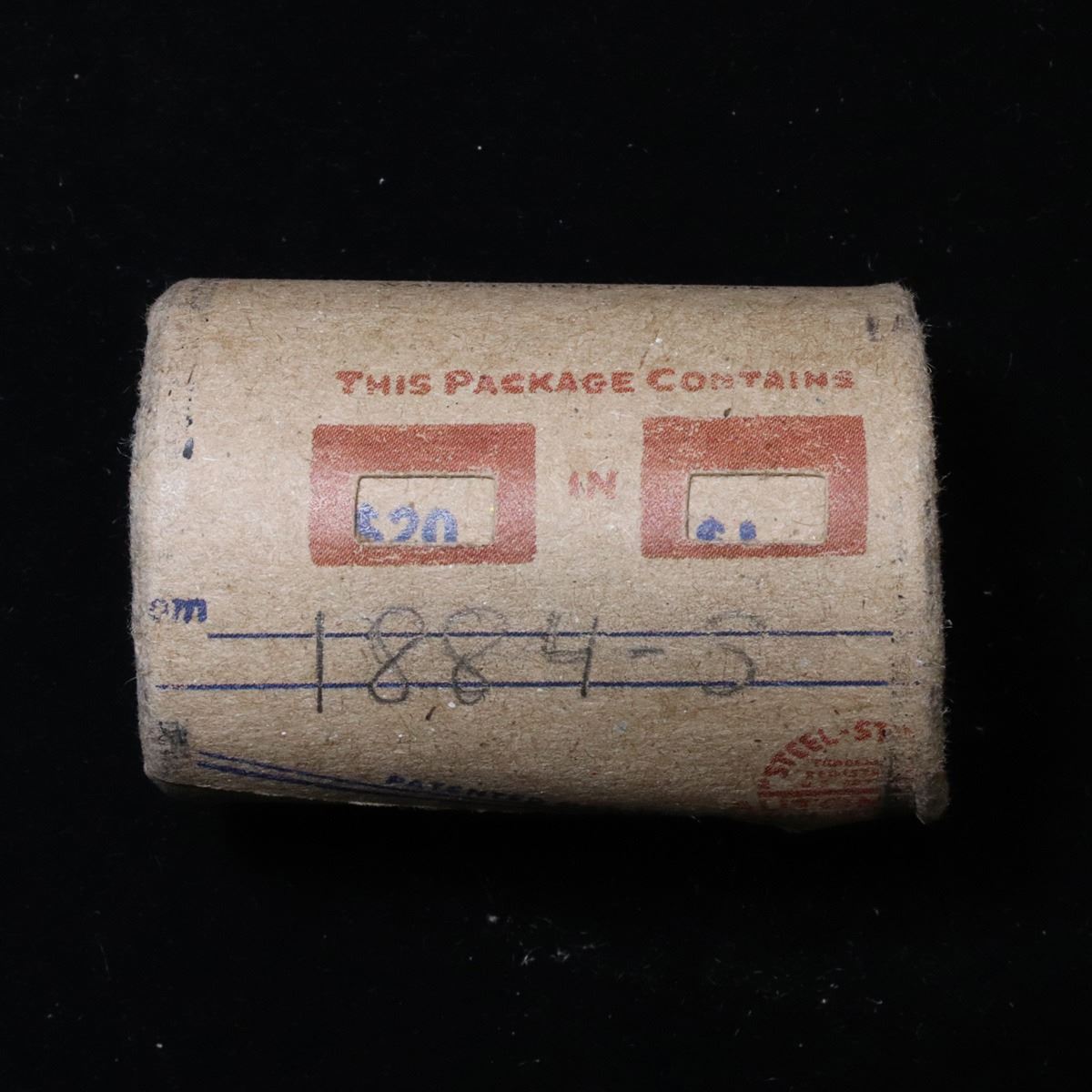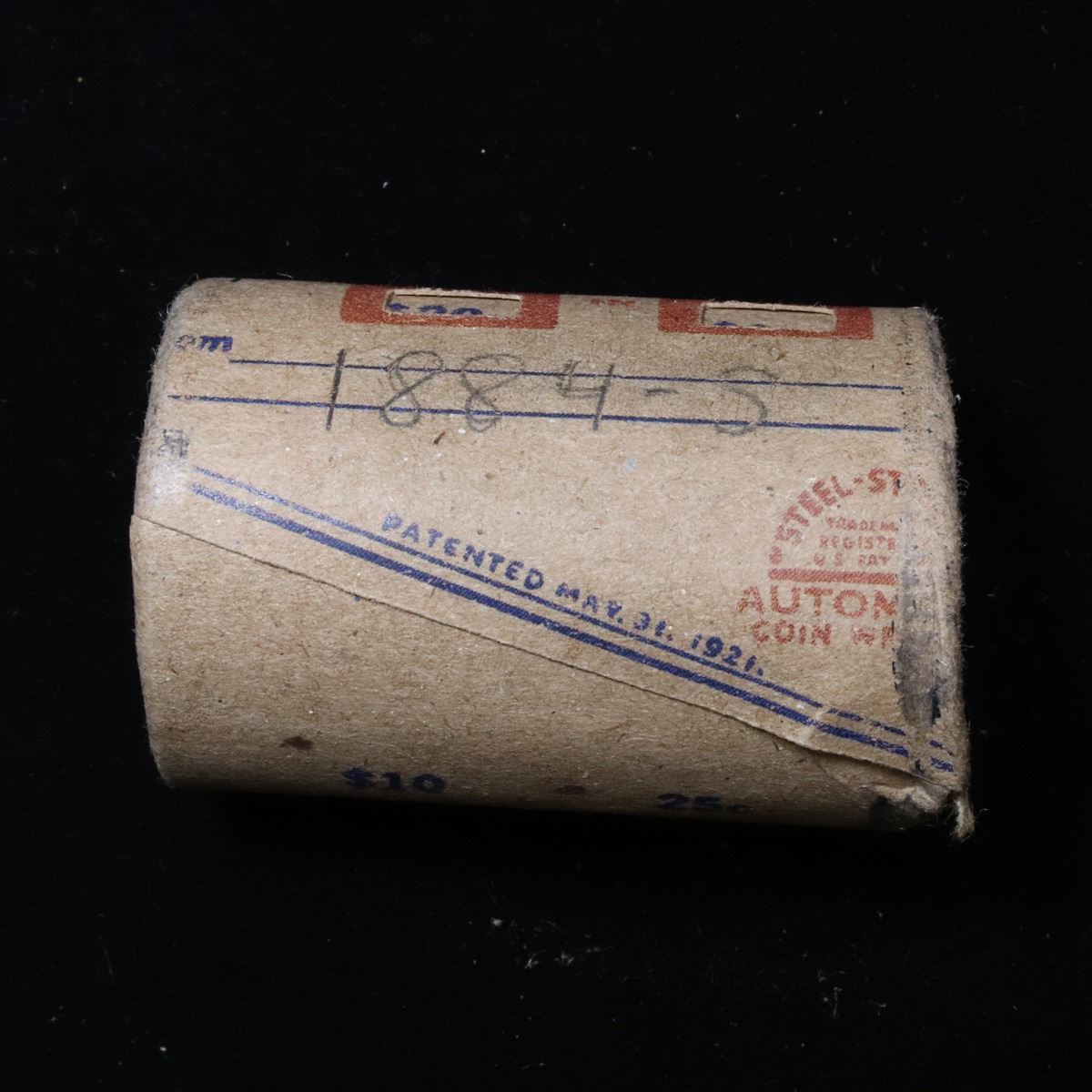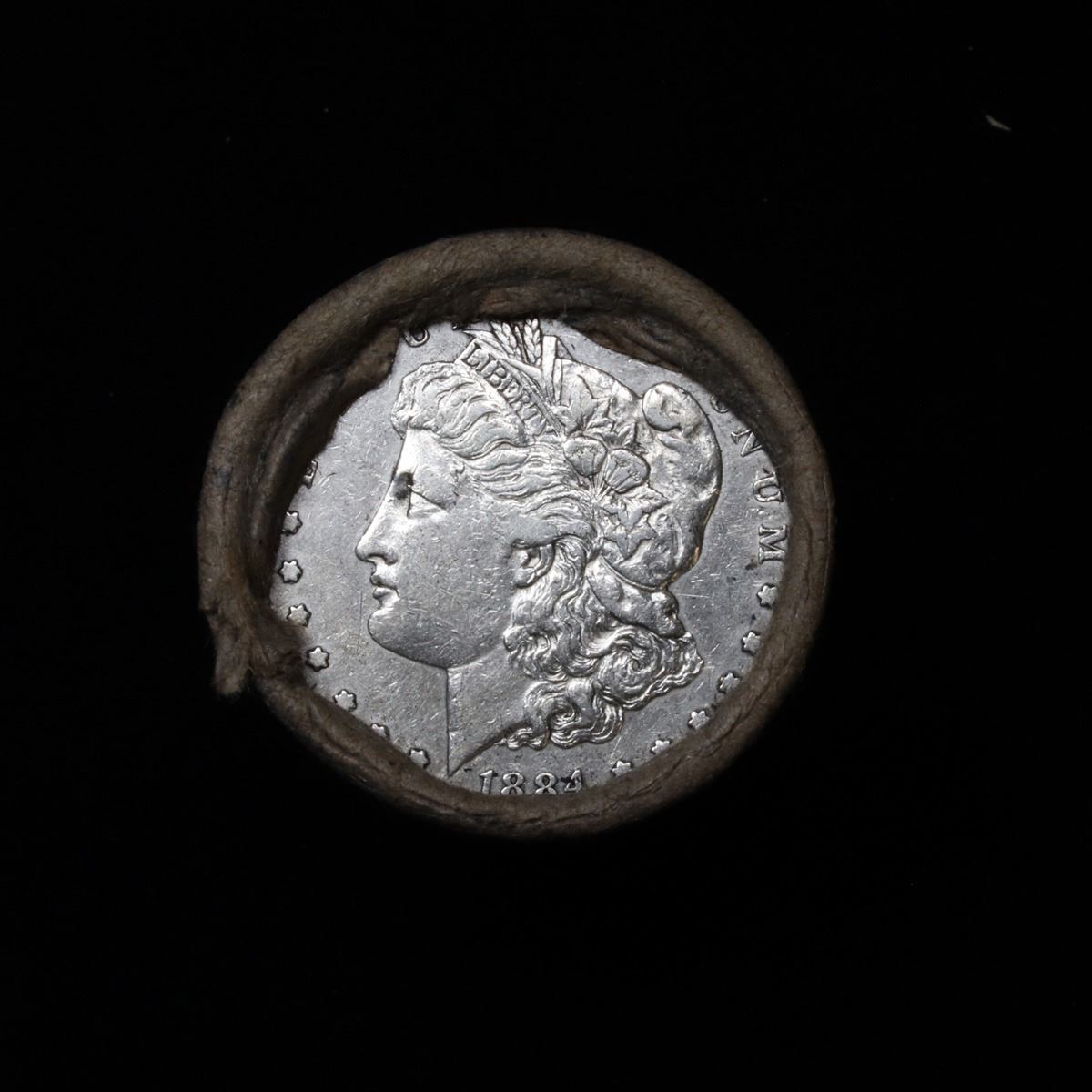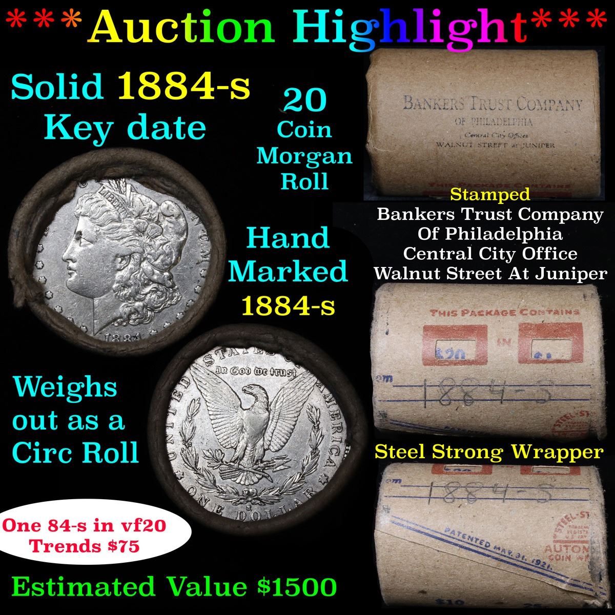***Auction Highlight*** Full solid date Ket date 1884-s Morgan silver dollar roll, 20 coins . This roll is held in an old Steel strong wrapper, patented 1921, stamped "Bankers Trust Company of PhiladelphiaÓ, Walnut Street at Juniper. This roll contains 20, Key Date 1884-s Morgan silver Dollars. The coins may range from circulated to uncirculated. Any condition is possible. We have weighed the roll and can assure you that it is 20 Silver Dollars, that all 20 are 1884-s and that it is not an uncirculated roll as the weight comes in slightly under the 534.60 grams that a fully uncirculated roll would weigh. We recently Acquired a large Estate Hoard of solid date Rolls. Trends lists au50 at $225, xf40 at $120, vf20 at $75, f12 at $45, vg8 at $40, g4 at $35.