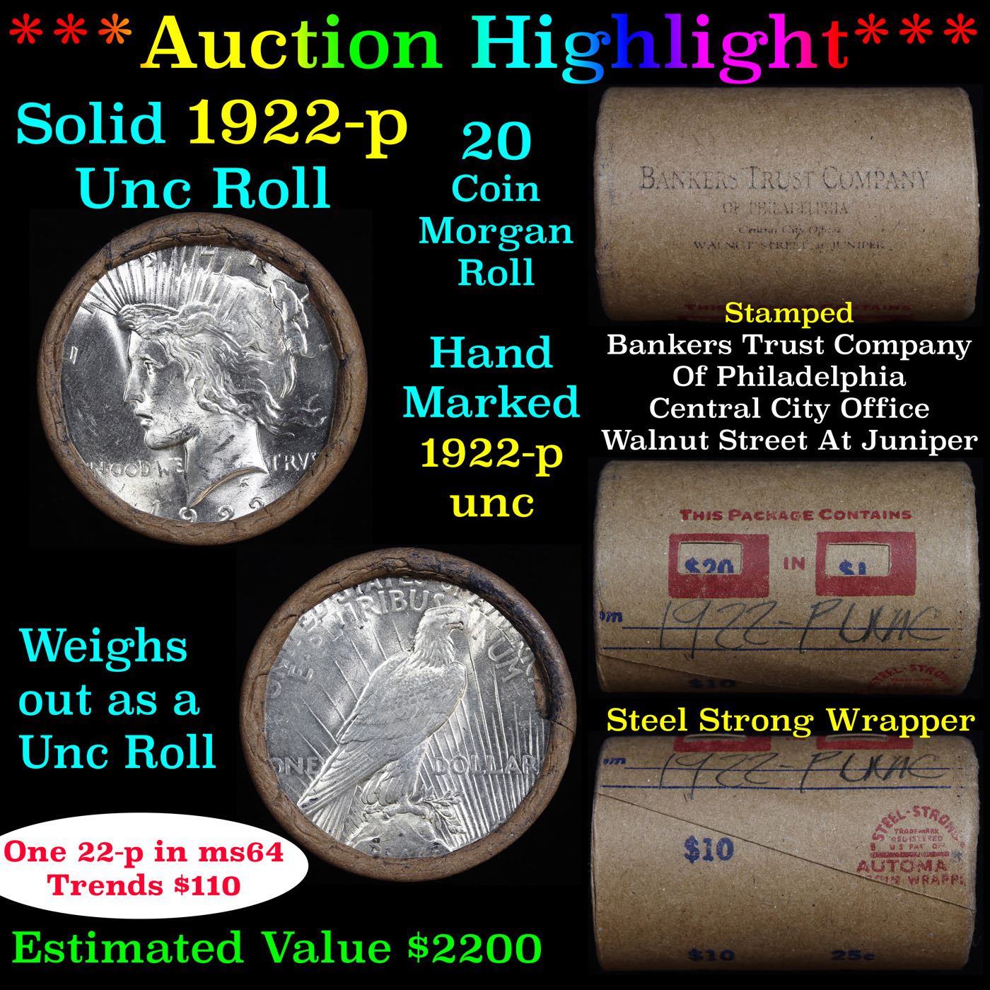 ***Auction Highlight*** Full solid date Uncirculated 1922-p Peace silver dollar roll, 20 coins. This roll is held in an old Steel strong wrapper, patented 1921, stamped "Bankers Trust Company of Philadelphia, Walnut Street at Juniper. This roll contains 20, 1922-p Uncirculated Peace silver Dollars. Based on the weight this is an uncirculated roll. We recently Acquired a large Estate Hoard of solid date Rolls. Trends lists ms63 at $70, ms64 at $85, and ms65 at $175.