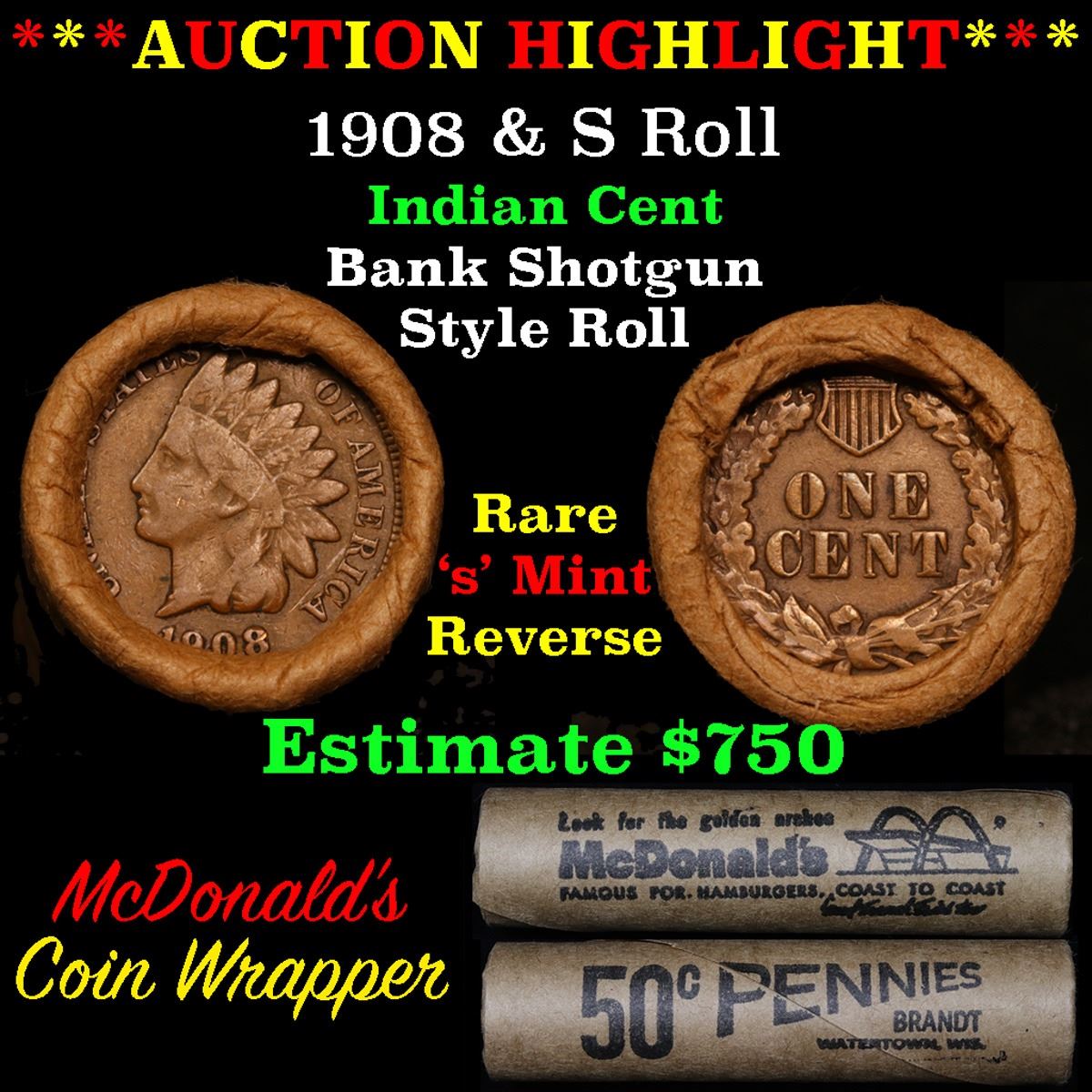 ***Auction Highlight*** Indian 1c Shotgun Roll, 1908 end, KEY date 's' mint on the other, Wow!. The roll is held in a Rare & Collectable McDonalds Brandt wrapper. A great bank style shotgun roll of Indian cents 1c with very tight ends. The rolls appear to be filled with a mixture of 1800's and 1900's. These shotgun rolls are all from a new consignee. They are all frrom one Estate. This particular Roll shows an 1909 on one end and a KEY date 's' mint on the reverse WOW!.