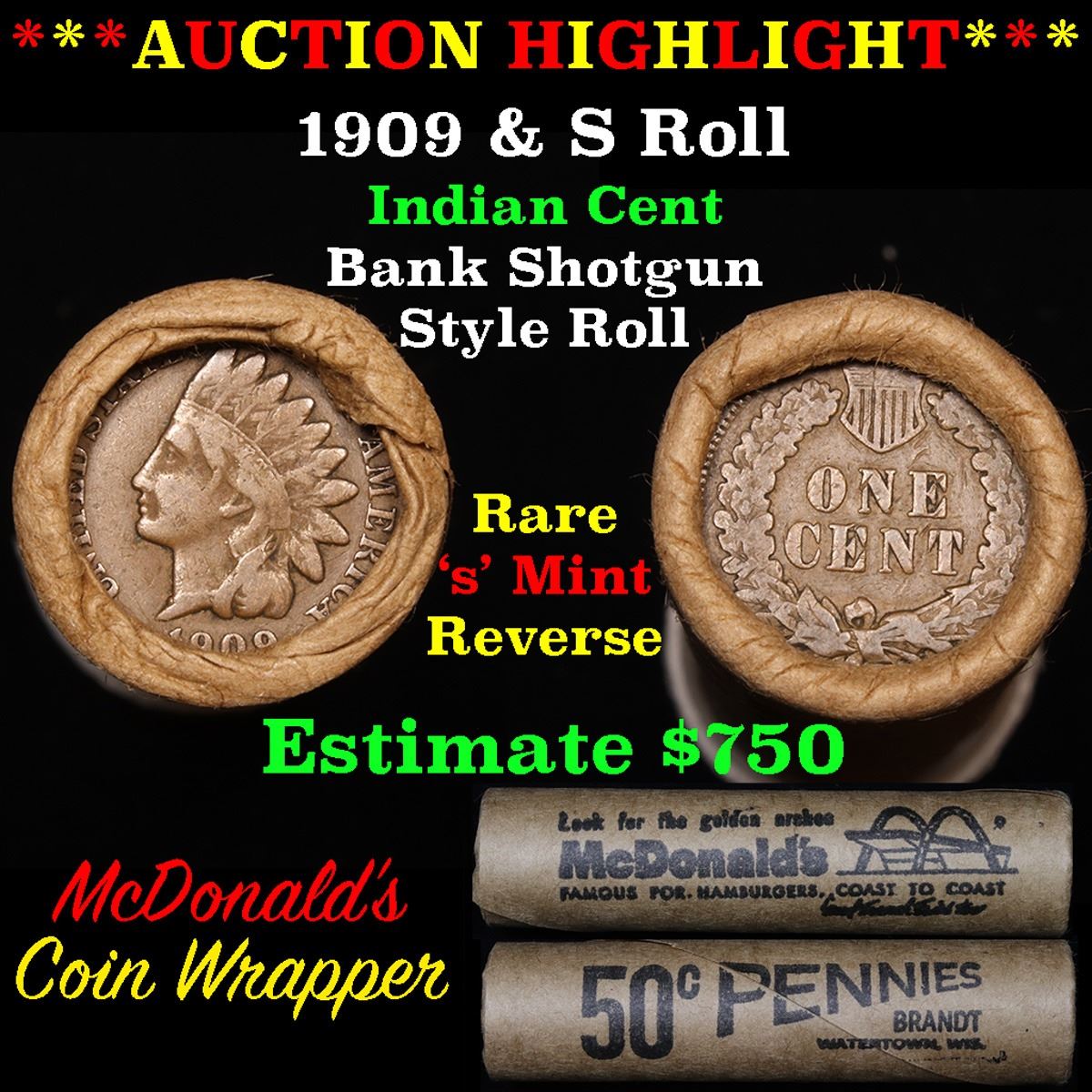***Auction Highlight*** Indian 1c Shotgun Roll, 1909 end, KEY date 's' mint on the other, Wow!. The roll is held in a Rare & Collectable McDonalds Brandt wrapper. A great bank style shotgun roll of Indian cents 1c with very tight ends. The rolls appear to be filled with a mixture of 1800's and 1900's. These shotgun rolls are all from a new consignee. They are all frrom one Estate. This particular Roll shows an 1909 on one end and a KEY date 's' mint on the reverse WOW!.