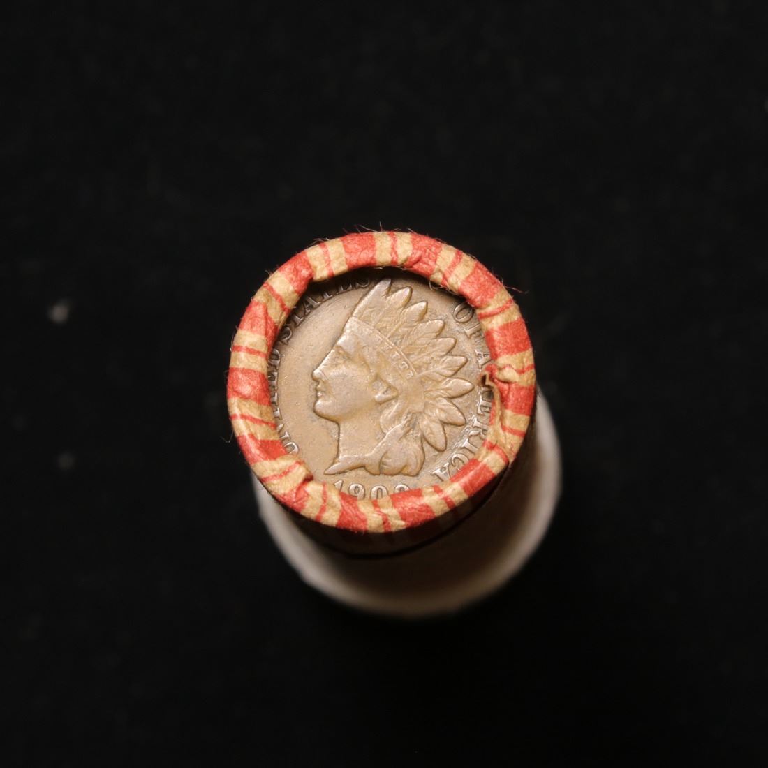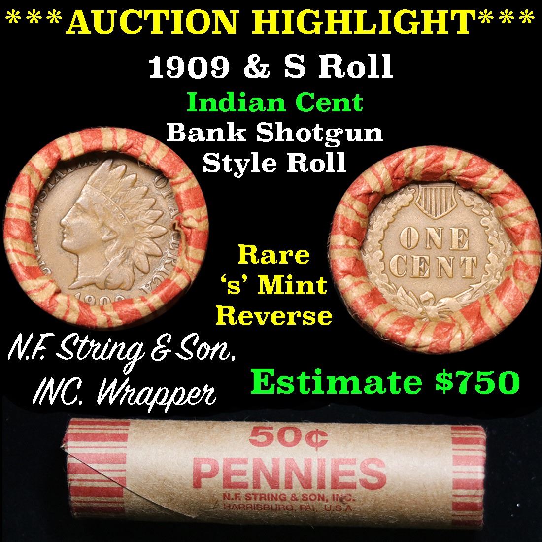 ***Auction Highlight*** Indian 1c Shotgun Roll, 1909 end, KEY date 's' mint on the other, Wow! . .. The Roll is in an old HF String & Sons coin wrapper'. A great bank style shotgun roll of Indian cents 1c with very tight ends. We have not had much feedback yet, but from what we have been told, the rolls appear to be filled with a mixture of 1800's and 1900's. These shotgun rolls are all from a new consignee. They are all frrom one Estate. This particular Roll shows an 1909 on one end and a KEY date 's' mint on the reverse WOW!.