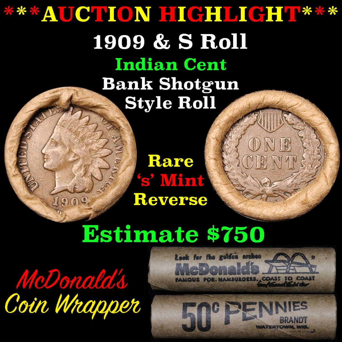 ***Auction Highlight*** Indian 1c Shotgun Roll, 1909 end, KEY date 's' mint other, Wow! . .. The Roll is in an Mcdonalds Collectible Brandt Wrapper'. A great bank style shotgun roll of Indian cents 1c with very tight ends. We have not had much feedback yet, but from what we have been told, the rolls appear to be filled with a mixture of 1800's and 1900's. These shotgun rolls are all from a new consignee. They are all frrom one Estate. This particular Roll shows an 1909 on one end and a KEY date 's' mint on the reverse WOW!.
