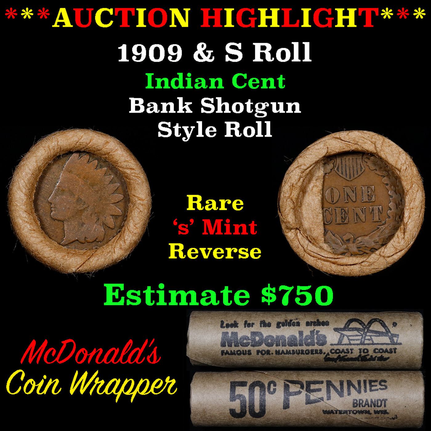 ***Auction Highlight*** Indian cent 1c orig McDonald's Brandt wrapper roll, 1909 end S other end. Indian cent 1c original Shotgun Roll, 1909 on one end, S reverse on the other. Actual roll pictured is the roll you will get. A great original bank shotgun roll with very tight ends. From the feedback we have been receiving, people are happy with these roll. These shotgun rolls are all from a new consignee. They are all frrom one Estate. This particular Roll shows a 1909 on one end and a S reverse on the other end.