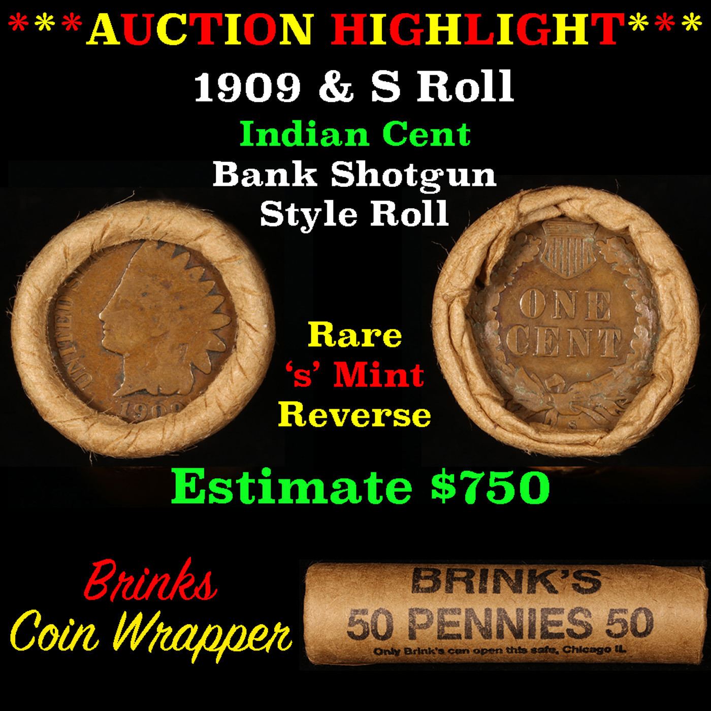 ***Auction Highlight*** Indian cent 1c orig roll, 1909 end S other end. Indian cent 1c original Shotgun Roll, 1909 on one end, S reverse on the other. Actual roll pictured is the roll you will get. A great original bank shotgun roll with very tight ends. From the feedback we have been receiving, people are happy with these rolls, nearly half the roll seems to be teens, all the rolls have a few Indians, most of the rolls have some steel cents, and a lot of the wheaties are mintmarks. These shotgun rolls are all from a new consignee. They are all frrom one Estate. This particular Roll shows a 1909 on one end and a S reverse on the other end.