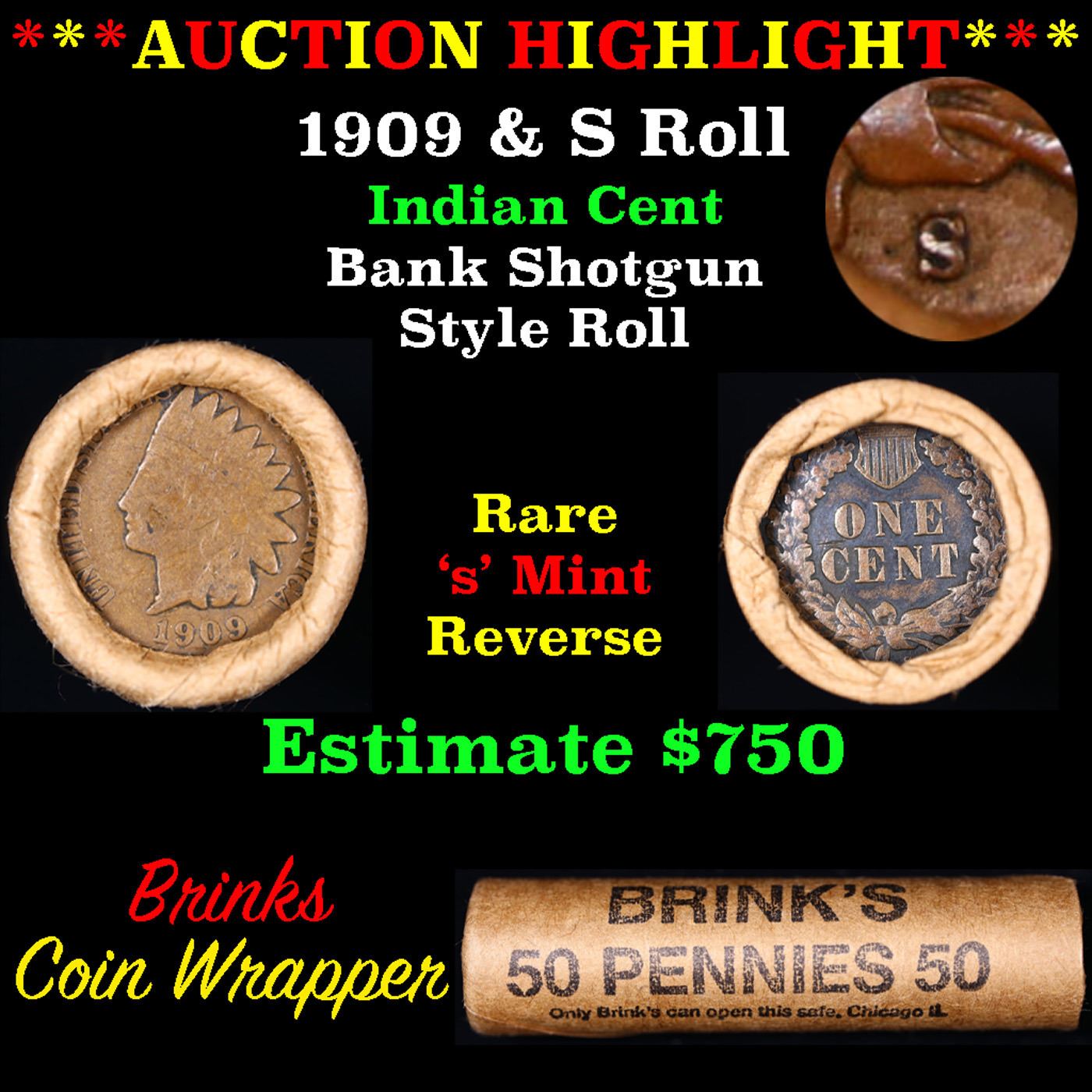 ***Auction Highlight*** Indian cent 1c orig roll, 1909 end S other end. Indian cent 1c held in old Rare & Collectable Brinks 'Only Brinks Can Open This Safe, Chicago IL' Penny wrapper, 1909 on one end, S reverse on the other. A great original bank shotgun roll with very tight ends. From the feedback we have been receiving, people are happy with these rolls, nearly half the roll seems to be teens, all the rolls have a few Indians, most of the rolls have some steel cents, and a lot of the wheaties are mintmarks. These shotgun rolls are all from a new consignee. They are all frrom one Estate. This particular Roll shows a 1909 on one end and a S reverse on the other end.