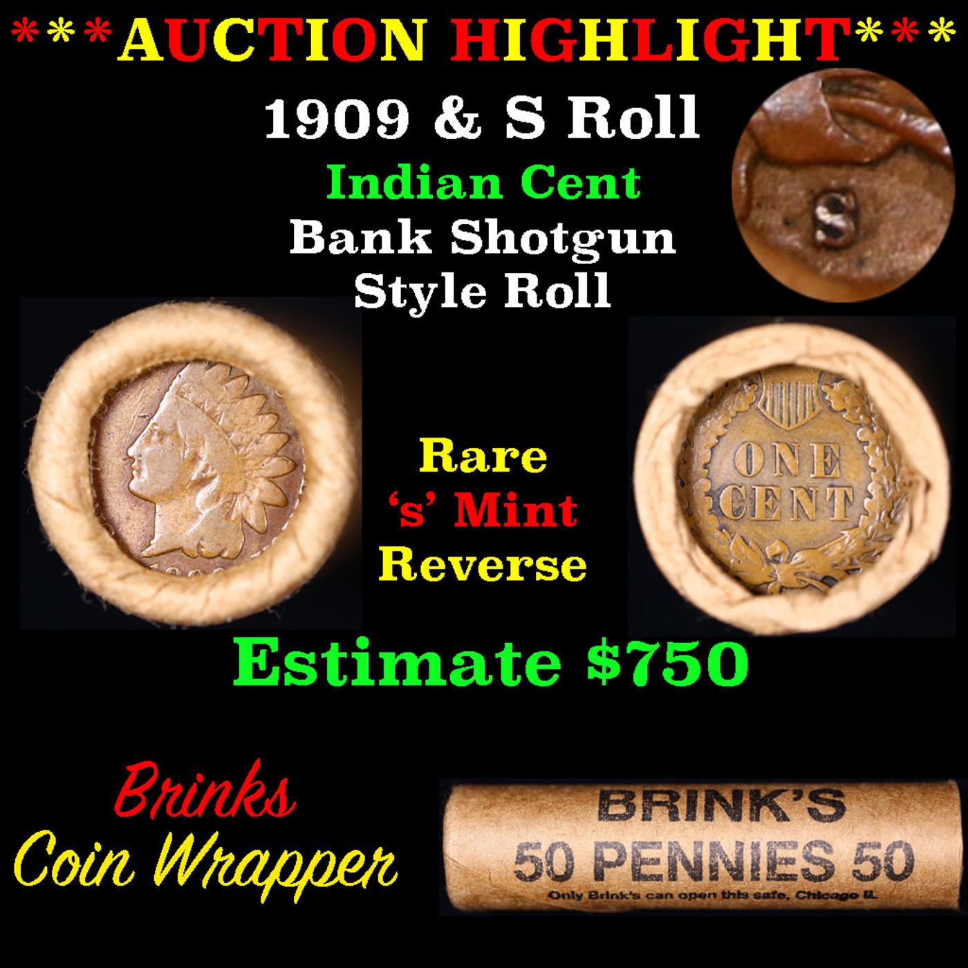 ***Auction Highlight*** Indian cent 1c orig roll, 1909 end S other end. Indian cent 1c original Shotgun Roll, 1909 on one end, S reverse on the other. Actual roll pictured is the roll you will get. A great original bank shotgun roll with very tight ends. From the feedback we have been receiving, people are happy with these rolls, nearly half the roll seems to be teens, all the rolls have a few Indians, most of the rolls have some steel cents, and a lot of the wheaties are mintmarks. These shotgun rolls are all from a new consignee. They are all frrom one Estate. This particular Roll shows a 1909 on one end and a S reverse on the other end.