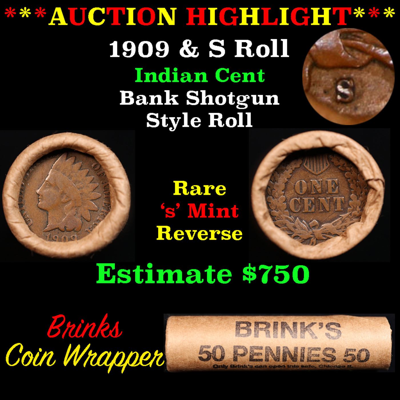 ***Auction Highlight*** Indian cent 1c orig roll, 1909 end S other end. Indian cent 1c original Shotgun Roll, 1909 on one end, S reverse on the other. Actual roll pictured is the roll you will get. The roll is held in a Rare & Collectable Brinks 'Only Brinks Can Open This Safe, Chicago IL' Penny Wrapper. From the feedback we have been receiving, people are happy with these rolls, nearly half the roll seems to be teens, all the rolls have a few Indians, most of the rolls have some steel cents, and a lot of the wheaties are mintmarks. These shotgun rolls are all from a new consignee. They are all frrom one Estate. This particular Roll shows a 1909 on one end and a S reverse on the other end.