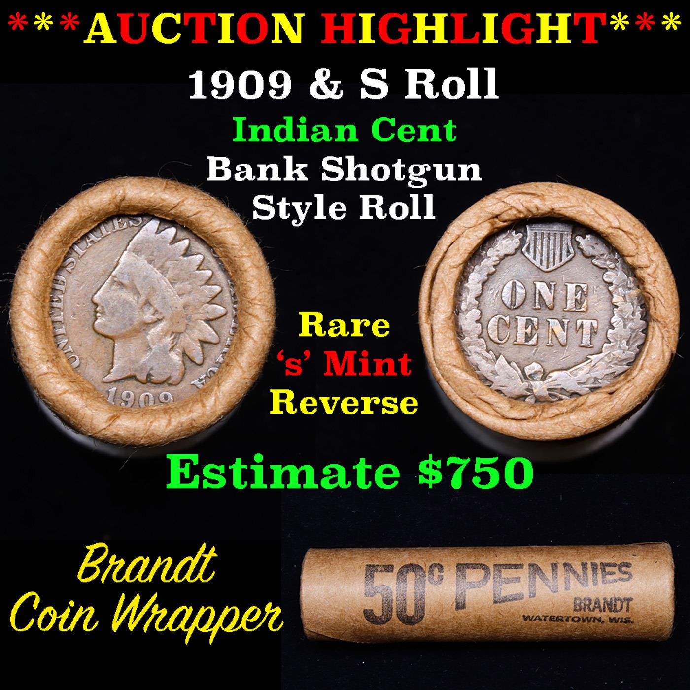 ***Auction Highlight*** Indian cent 1c orig roll, 1909 end S other end. The roll is held in an old Brandt wrapper. A great bank style shotgun roll of Indian cents 1c with very tight ends. The rolls appear to be filled with a mixture of 1800's and 1900's. These shotgun rolls are all from a new consignee. They are all frrom one Estate. This particular Roll shows an 1909 on one end and a KEY date 's' mint on the reverse WOW!.