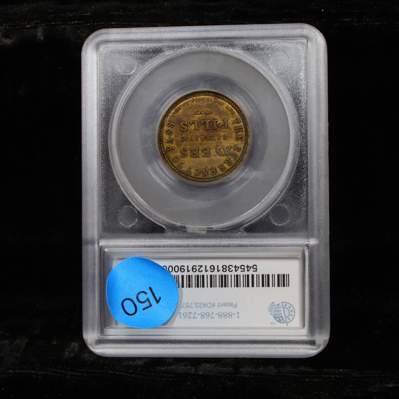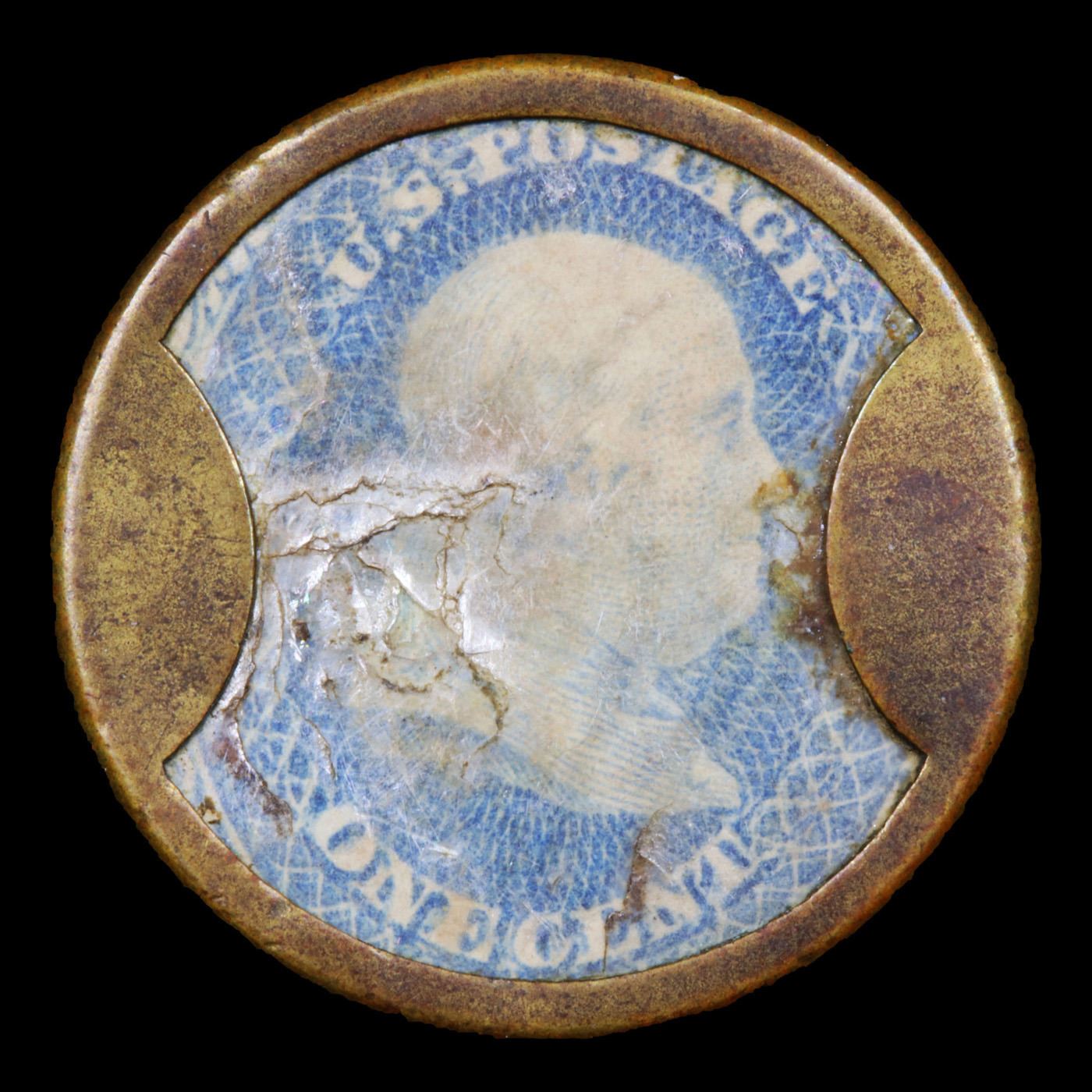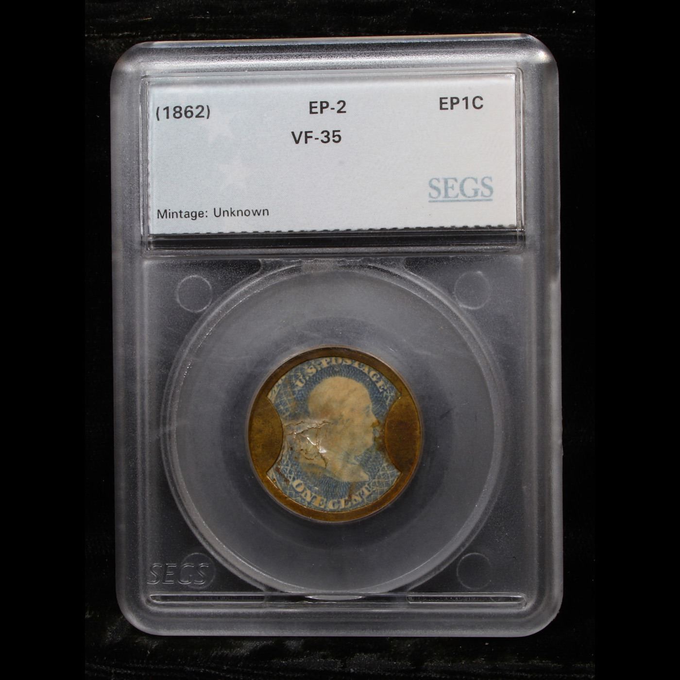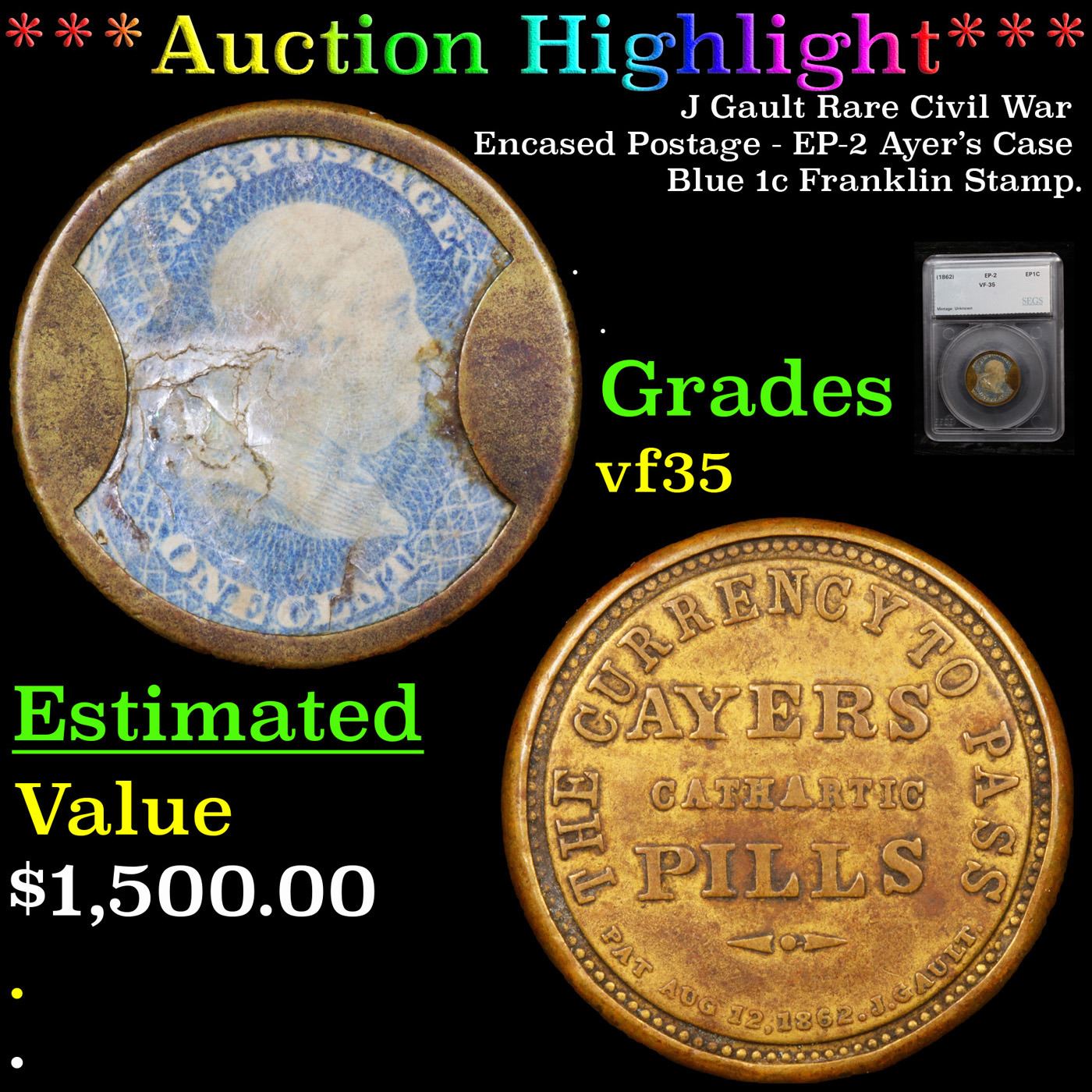 ***Auction Highlight*** J Gault Rare Civil War Encased Postage - EP-2 Ayer’s Case Blue 1c Franklin Stamp. Graded vf35 By SEGS. Up for Auction is One of The Civil War’s Foremost Rarities, The “Encased Postage” coin. While not Technically a Coin, a Note or a Stamp, John Gault’s Encased Postage was king of currency For a Brief Year in 1862. When The Civil war Broke out in 1861, all of the “Hard Currency” quickly Disappeared. But people still needed to purchase a 3¢ loaf of bread, a 1¢ newspaper, a 5¢ quart of milk and countless other goods that required coins. And vendors had to make change when an item’s price was less than a nickel, a dime or a quarter. In some cities, businesses gave customers I.O.Us, private companies created “Civil War tokens” and paper money was cut into several pieces to represent a fraction of a dollar. Clever remedies for sure, but none that were widely used or accepted. All of this radically changed on July 17, 1862, when Congress decided to address the coinage shortage and passed a law that allowed postage stamps to satisfy debts of less than $5. People began to carry stamps in their purses and pockets and used them repeatedly for daily purchases. Vendors gladly accepted the stamps as payment. But all of this hand-to-hand usage quickly resulted in damaged stamps with denominations sometimes unrecognizable. The local post offices would not exchange damaged stamps for new ones, so a remedy was needed. John Gault, a New York entrepreneur, decided he had the best solution. On August 12, 1862, Gault obtained a patent for a “postage stamp case”, or as he named the item in a newspaper advertisement, the “New Metallic Currency. Gault didn’t sell the encased stamps to the public. Instead, he sold them to stores and businesses that needed “coinage” to make change for customers’ purchases. Gault’s profit came from the 20% markup over the face value of the stamp. To increase his potential profit, Gault’s second idea was to inscribe advertising on the back of the encased stamp. He would charge companies who purchased the metallic currency an additional 2¢ for each item. Encased stamps were widely accepted in the general commerce realm until later in 1862 when the government issued “fractional currency”. This legitimate, government-sanctioned currency quickly eliminated the coin shortage. Having no other value than the stamp, people tore apart the encasements of their metallic currency to remove the stamp to use as postage. Thus the scarcity of the 1862 encased stamps today. The Example being offered today is EP-2, The Currency to Pass Ayer’s Cathartic PILLS, 1c Blue Colored Benjamin Franklin Stamp. The case has a nice Patina, with no issues, The Mica has a small amount of crazing and is 90% intact and the Stamp is Clear bright and pleasing A Corey's Pick, Bid to Win, Don't let it get Away Coin