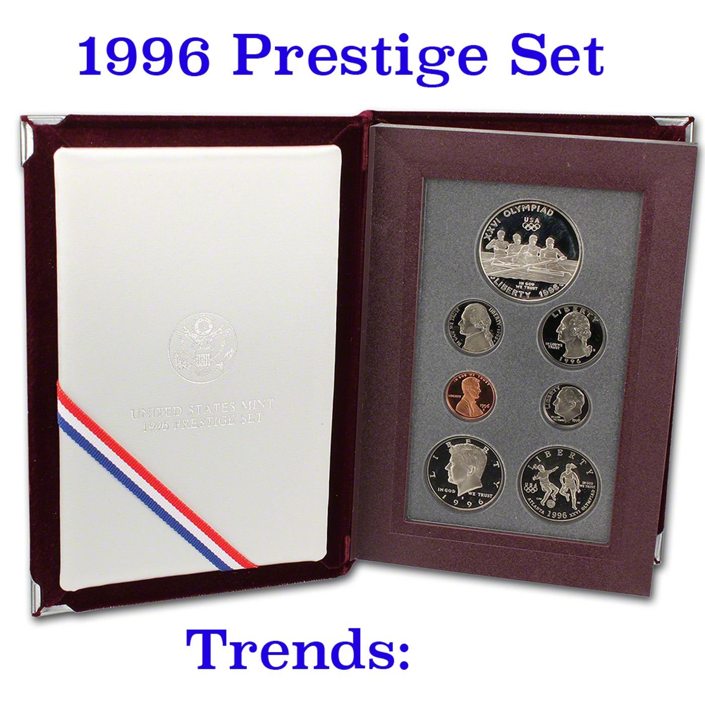 ***Auction Highlight*** ***KEY to the Series 1996 United States Mint Prestige Proof Set RARE***. Contains the 1996 US Olympic Atlanta Centennial Games 90% silver US Dollar & the 1996 US Olympic Atlanta Centennial Games Half Dollar plus the Traditional 5 pieces 1996 Proof Set. KEY SET TO THE SERIES!!!! Hard to find!!! About 1oz Of Silver