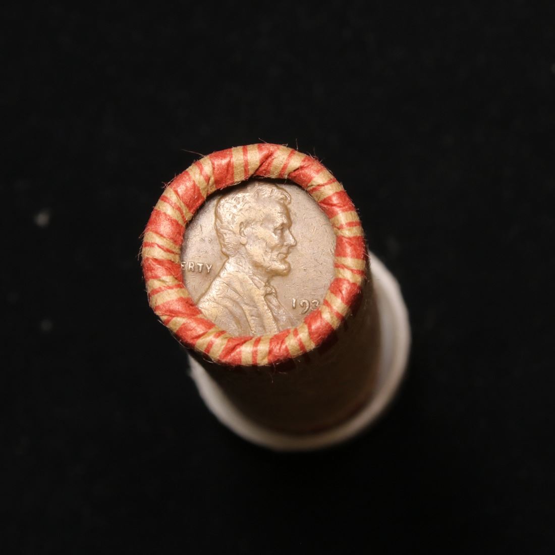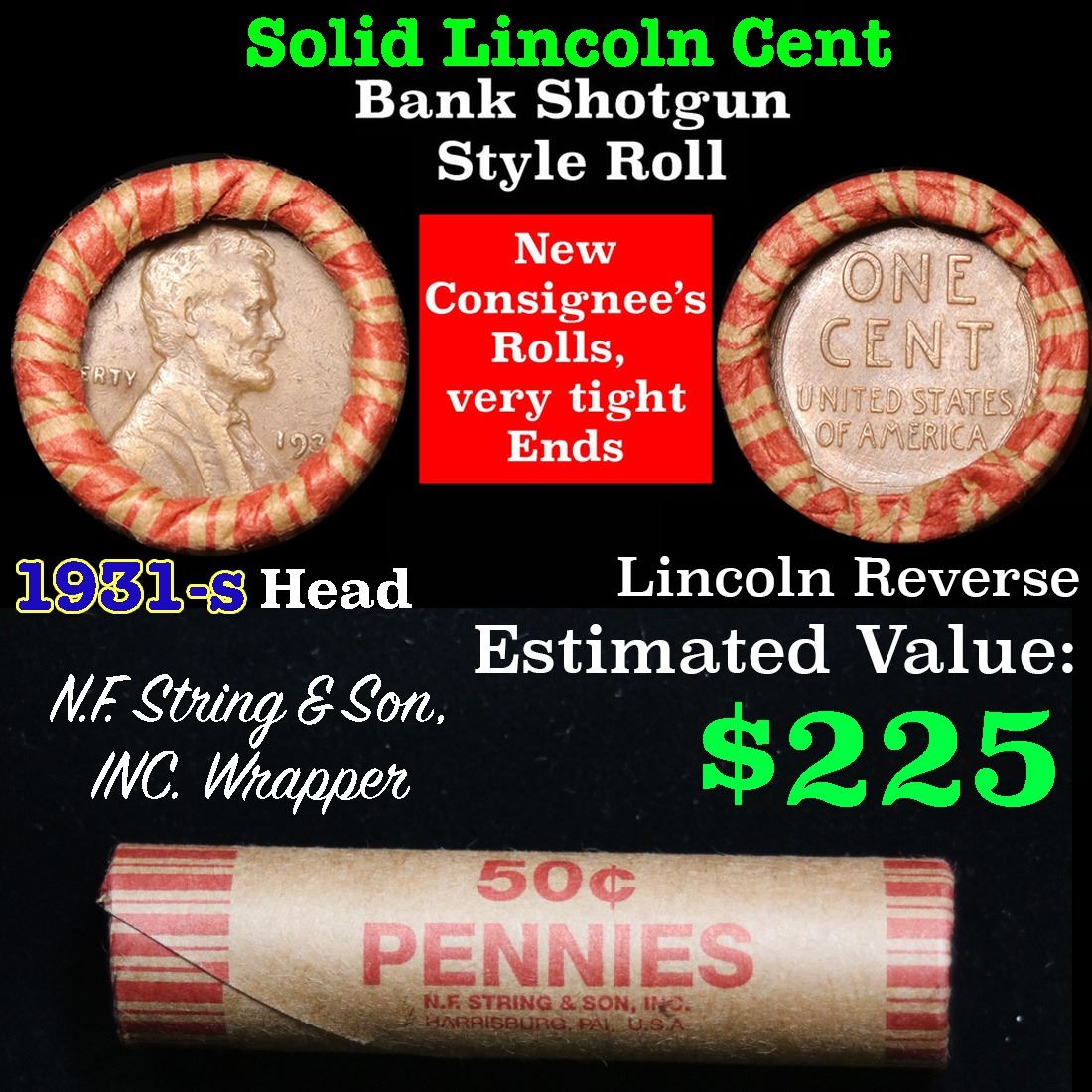 ***Auction Highlight*** Key Date 1931-s Wheat Cent end, Mixed small cents 1c orig shotgun roll, WOW. The roll is held in an old HF String & Sons wrapper. Actual roll pictured is the roll you will get. Key date 1931-s Wheat cent on one end, Wheat cent reverse other end. A great original bank style shotgun roll with very tight ends. We have been getting excellent feedback on these rolls. Were being told that close to half the roll are teens, some with mintmarks, there are a few Indians in all the rolls, most of the rolls have steel cents. They seem to be PQ Wheaties rolls. These shotgun rolls are all from a new consignee. They are all frrom one Estate.