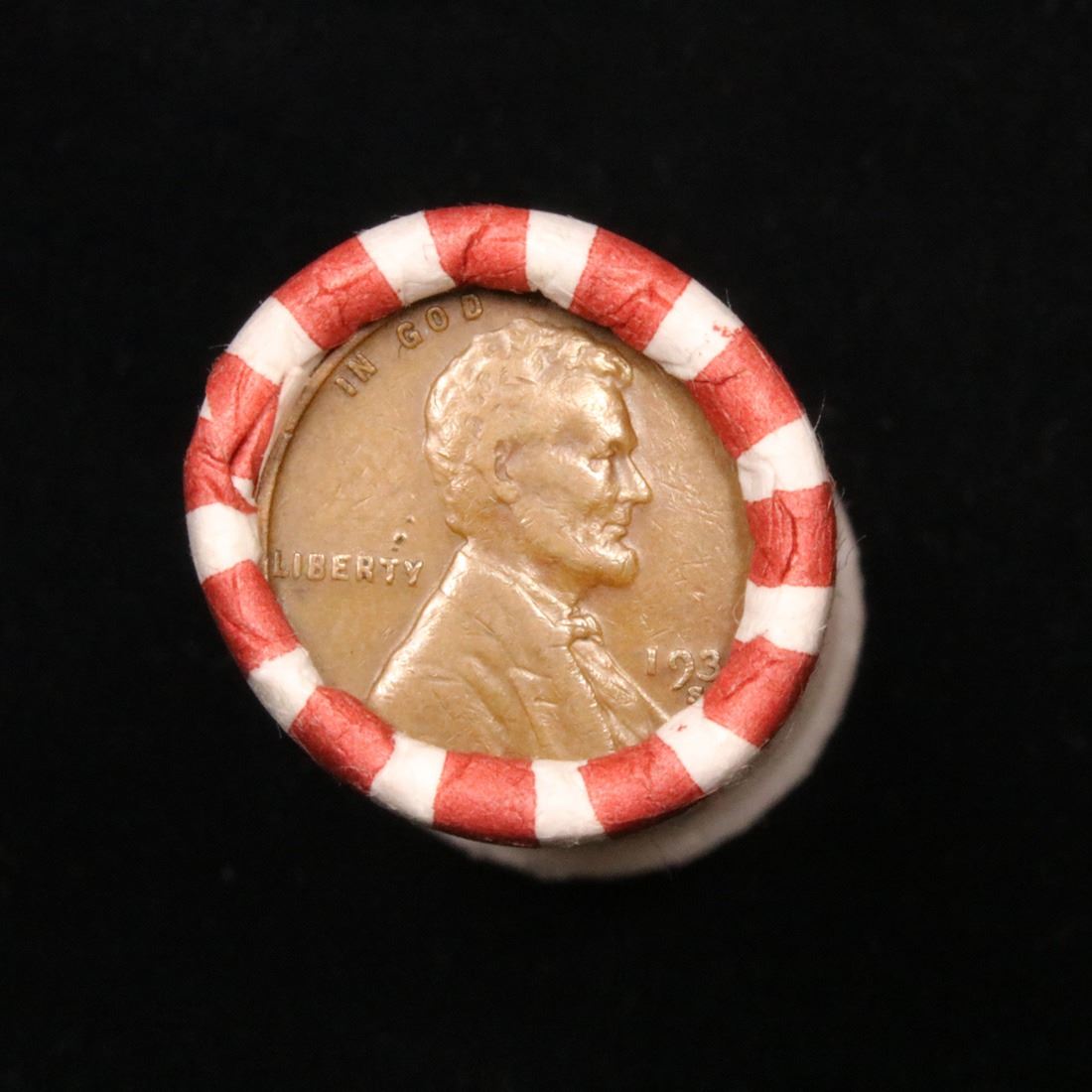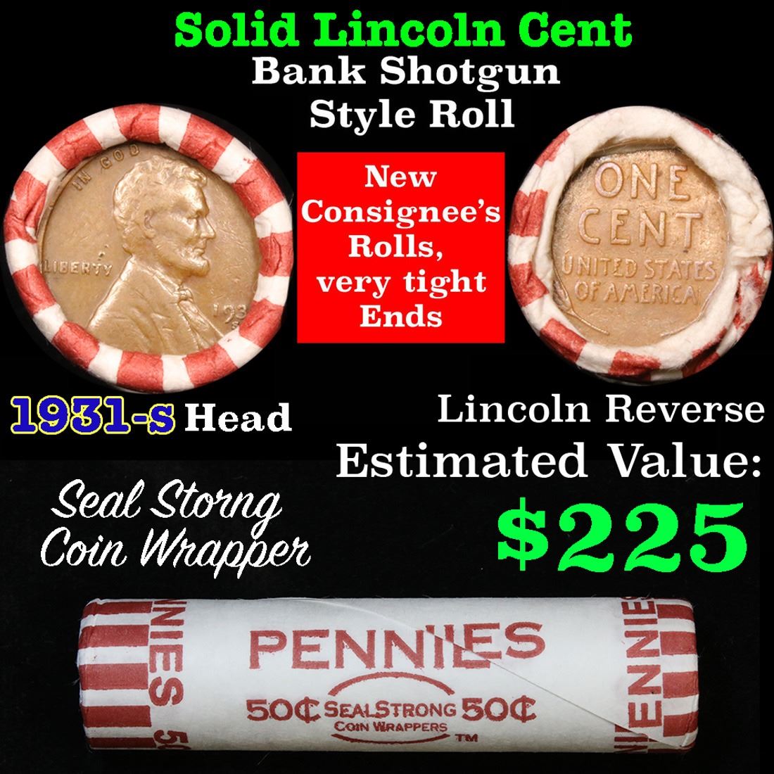 ***Auction Highlight*** Key Date 1931-s Wheat Cent end, Mixed small cents 1c orig shotgun roll, WOW. The roll is held in an old HF String & Sons wrapper. Actual roll pictured is the roll you will get. Key date 1931-s Wheat cent on one end, Wheat cent reverse other end. A great original bank style shotgun roll with very tight ends. We have been getting excellent feedback on these rolls. Were being told that close to half the roll are teens, some with mintmarks, there are a few Indians in all the rolls, most of the rolls have steel cents. They seem to be PQ Wheaties rolls. These shotgun rolls are all from a new consignee. They are all frrom one Estate.