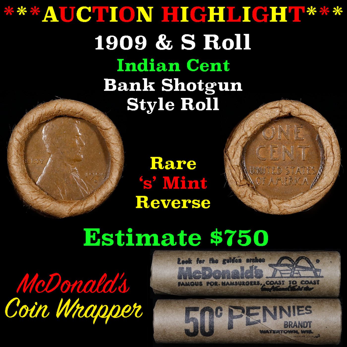 ***Auction Highlight*** Lincoln Wheat cent 1c orig Brandt McDonalds roll, 1909-s end, VDB other end. Lincoln Wheat cent 1c original Shotgun Roll, 1909-s on one end, VDB reverse on the other. Actual roll pictured is the roll you will get. A great original bank shotgun roll with very tight ends. From the feedback we have been receiving, people are happy with these rolls, nearly half the roll seems to be teens, all the rolls have a few Indians, most of the rolls have some steel cents, and a lot of the wheaties are mintmarks. These shotgun rolls are all from a new consignee. They are all frrom one Estate. This particular Roll shows a 1909-s on one end and a VDB reverse on the other end.