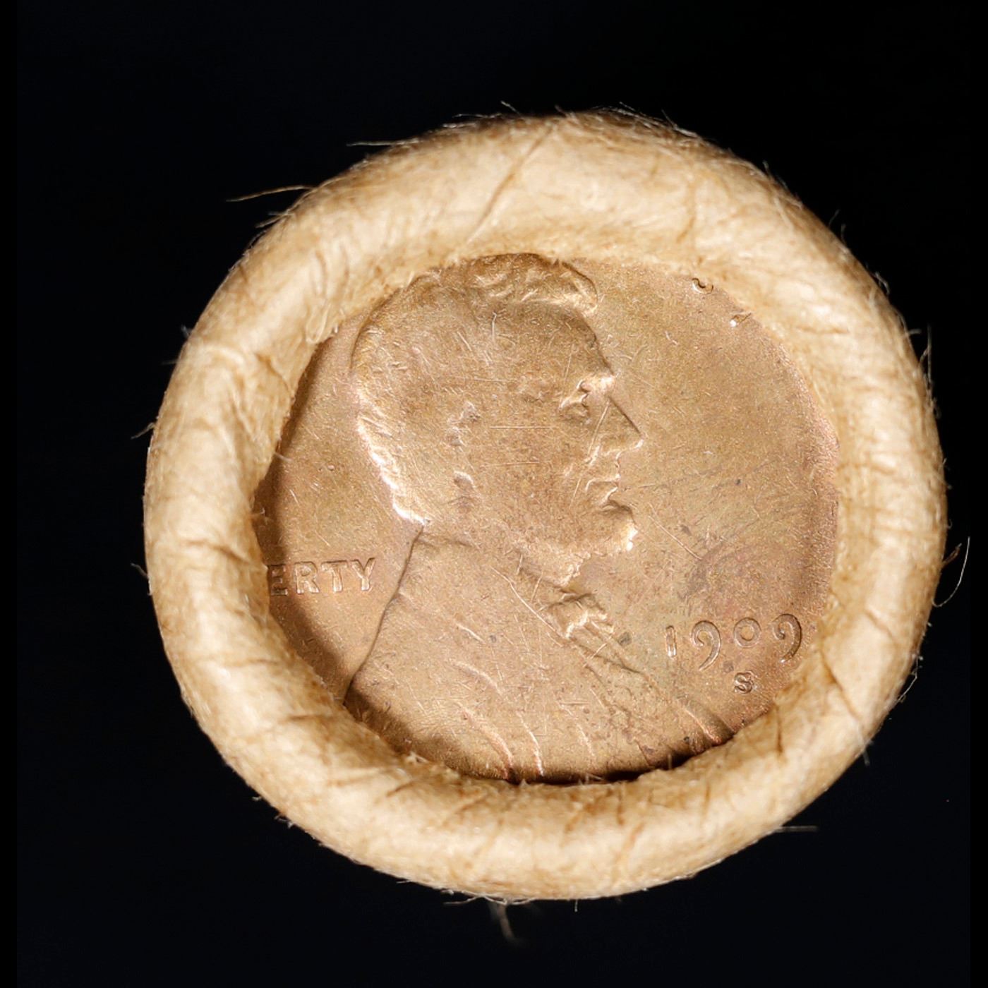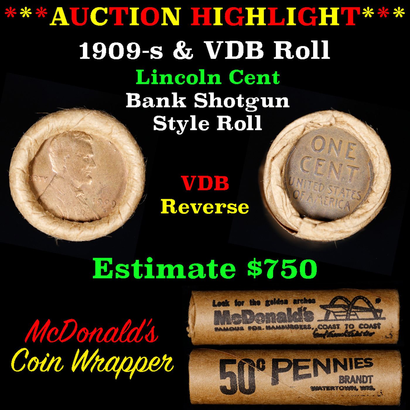 ***Auction Highlight*** Lincoln Wheat cent 1c orig Brandt McDonalds roll, 1909-s end, VDB other end. Lincoln Wheat cent 1c original Shotgun Roll, 1909-s on one end, VDB reverse on the other. Actual roll pictured is the roll you will get. A great original bank shotgun roll with very tight ends. From the feedback we have been receiving, people are happy with these rolls, nearly half the roll seems to be teens, all the rolls have a few Indians, most of the rolls have some steel cents, and a lot of the wheaties are mintmarks. These shotgun rolls are all from a new consignee. They are all frrom one Estate. This particular Roll shows a 1909-s on one end and a VDB reverse on the other end.