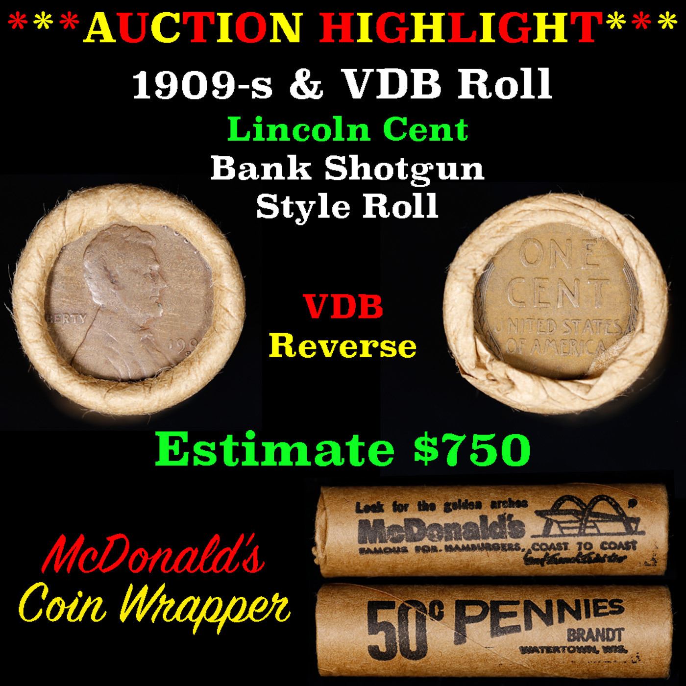 ***Auction Highlight*** Lincoln Wheat cent 1c orig Brandt McDonalds roll, 1909-s end, VDB other end. Lincoln Wheat cent 1c original Shotgun Roll, 1909-s on one end, VDB reverse on the other. Actual roll pictured is the roll you will get. A great original bank shotgun roll with very tight ends. From the feedback we have been receiving, people are happy with these rolls, nearly half the roll seems to be teens, all the rolls have a few Indians, most of the rolls have some steel cents, and a lot of the wheaties are mintmarks. These shotgun rolls are all from a new consignee. They are all frrom one Estate. This particular Roll shows a 1909-s on one end and a VDB reverse on the other end.