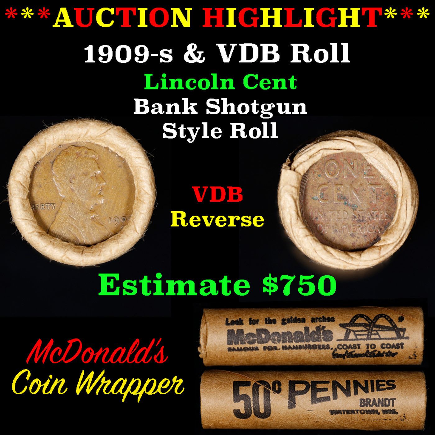 ***Auction Highlight*** Lincoln Wheat cent 1c orig Brandt McDonalds roll, 1909-s end, VDB other end. Lincoln Wheat cent 1c original Shotgun Roll, 1909-s on one end, VDB reverse on the other. Actual roll pictured is the roll you will get. A great original bank shotgun roll with very tight ends. From the feedback we have been receiving, people are happy with these rolls, nearly half the roll seems to be teens, all the rolls have a few Indians, most of the rolls have some steel cents, and a lot of the wheaties are mintmarks. These shotgun rolls are all from a new consignee. They are all frrom one Estate. This particular Roll shows a 1909-s on one end and a VDB reverse on the other end.
