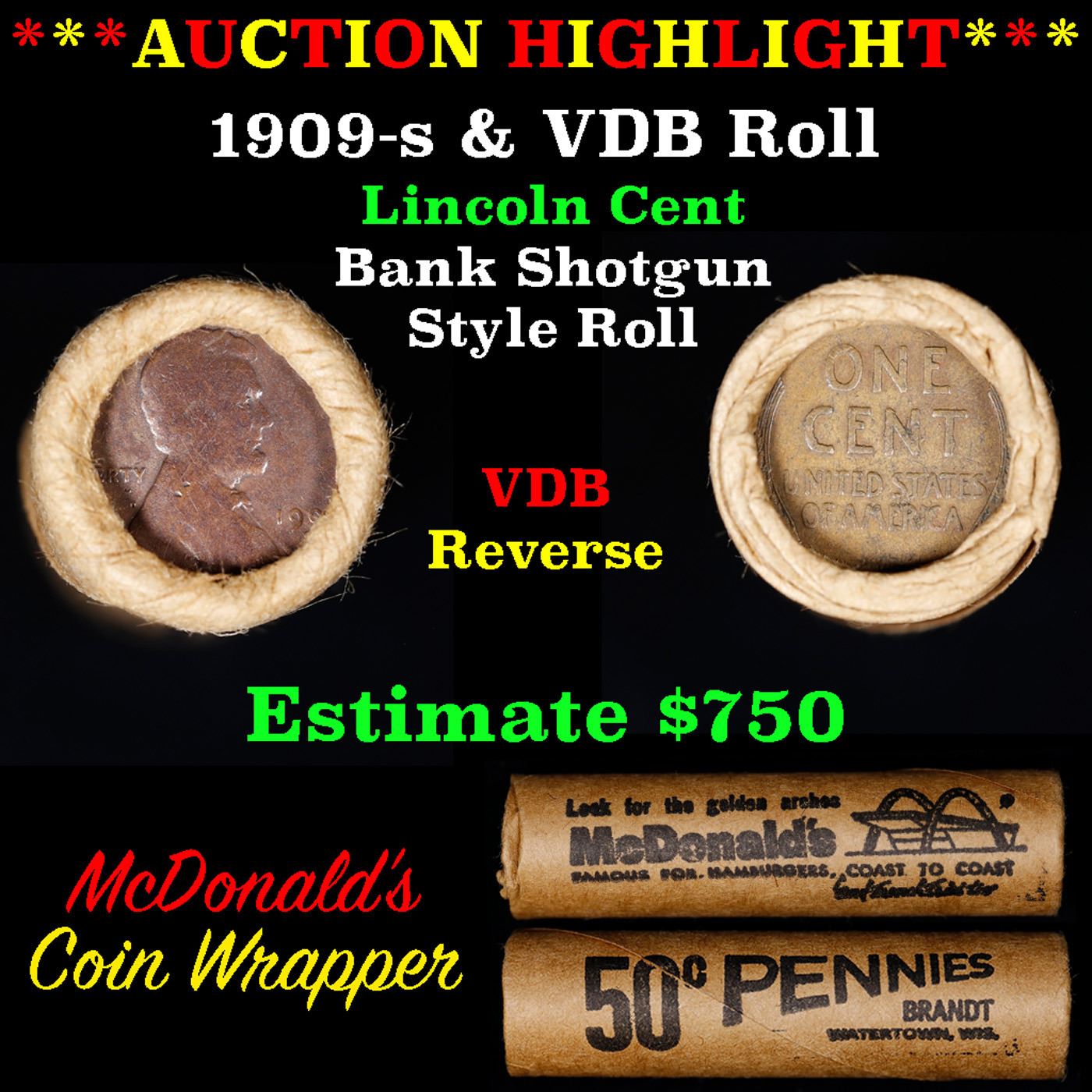 ***Auction Highlight*** Lincoln Wheat cent 1c orig Brandt McDonalds roll, 1909-s end, VDB other end. Lincoln Wheat cent 1c original Shotgun Roll, 1909-s on one end, VDB reverse on the other. Actual roll pictured is the roll you will get. A great original bank shotgun roll with very tight ends. From the feedback we have been receiving, people are happy with these rolls, nearly half the roll seems to be teens, all the rolls have a few Indians, most of the rolls have some steel cents, and a lot of the wheaties are mintmarks. These shotgun rolls are all from a new consignee. They are all frrom one Estate. This particular Roll shows a 1909-s on one end and a VDB reverse on the other end.
