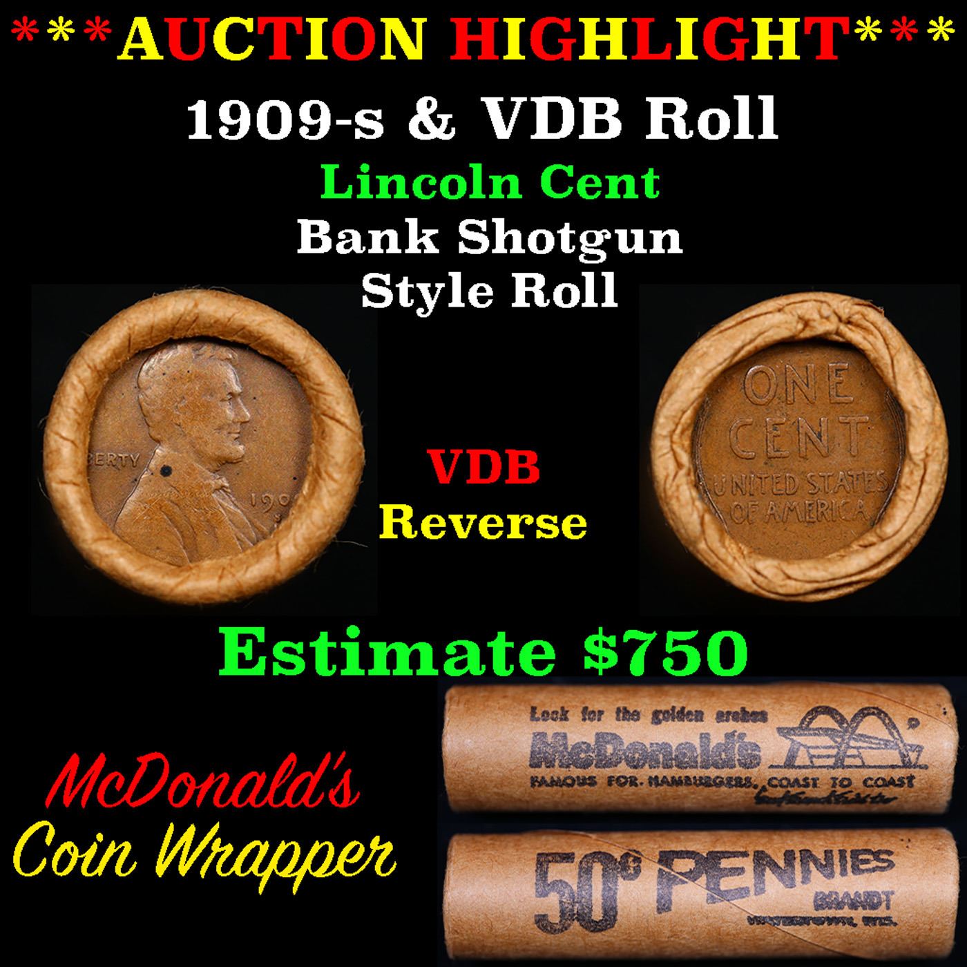 ***Auction Highlight*** Lincoln Wheat cent 1c orig Brandt McDonalds roll, 1909-s end, VDB other end. Lincoln Wheat cent 1c original Shotgun Roll, 1909-s on one end, VDB reverse on the other. Actual roll pictured is the roll you will get. A great original bank shotgun roll with very tight ends. From the feedback we have been receiving, people are happy with these rolls, nearly half the roll seems to be teens, all the rolls have a few Indians, most of the rolls have some steel cents, and a lot of the wheaties are mintmarks. These shotgun rolls are all from a new consignee. They are all frrom one Estate. This particular Roll shows a 1909-s on one end and a VDB reverse on the other end.