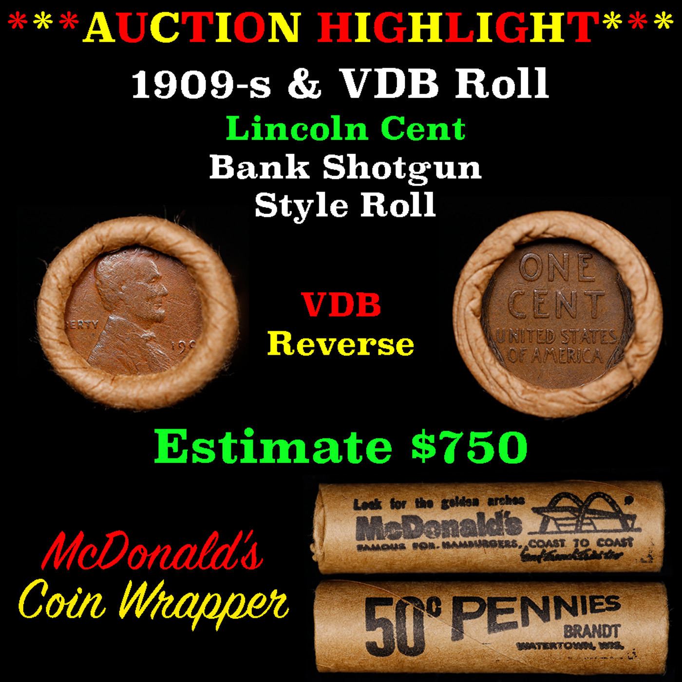 ***Auction Highlight*** Lincoln Wheat cent 1c orig Brandt McDonalds roll, 1909-s end, VDB other end. Lincoln Wheat cent 1c original Shotgun Roll, 1909-s on one end, VDB reverse on the other. Actual roll pictured is the roll you will get. A great original bank shotgun roll with very tight ends. From the feedback we have been receiving, people are happy with these rolls, nearly half the roll seems to be teens, all the rolls have a few Indians, most of the rolls have some steel cents, and a lot of the wheaties are mintmarks. These shotgun rolls are all from a new consignee. They are all frrom one Estate. This particular Roll shows a 1909-s on one end and a VDB reverse on the other end.