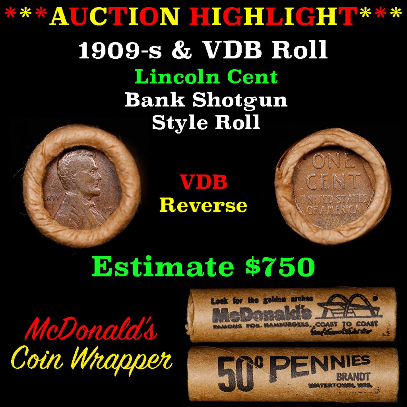 ***Auction Highlight*** Lincoln Wheat cent 1c orig Brandt McDonalds roll, 1909-s end, VDB other end. Lincoln Wheat cent 1c original Shotgun Roll, 1909-s on one end, VDB reverse on the other. Actual roll pictured is the roll you will get. A great original bank shotgun roll with very tight ends. From the feedback we have been receiving, people are happy with these rolls, nearly half the roll seems to be teens, all the rolls have a few Indians, most of the rolls have some steel cents, and a lot of the wheaties are mintmarks. These shotgun rolls are all from a new consignee. They are all frrom one Estate. This particular Roll shows a 1909-s on one end and a VDB reverse on the other end.