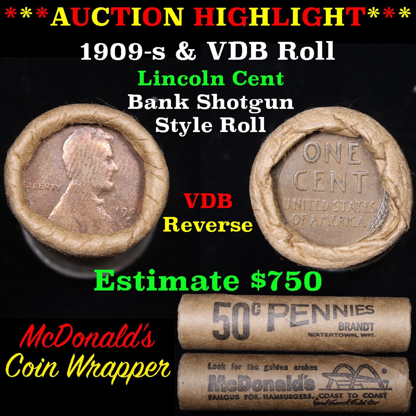 ***Auction Highlight*** Lincoln Wheat cent 1c orig roll, 1909-s end, VDB other end Grades. Lincoln Wheat cent 1c original Shotgun Roll, 1909-s on one end, VDB reverse on the other. The roll is held in a Rare & Collectable McDonalds Brandt wrapper. Actual roll pictured is the roll you will get. A great original bank shotgun roll with very tight ends. From the feedback we have been receiving, people are happy with these rolls, nearly half the roll seems to be teens, all the rolls have a few Indians, most of the rolls have some steel cents, and a lot of the wheaties are mintmarks. These shotgun rolls are all from a new consignee. They are all frrom one Estate. This particular Roll shows a 1909-s on one end and a VDB reverse on the other end.