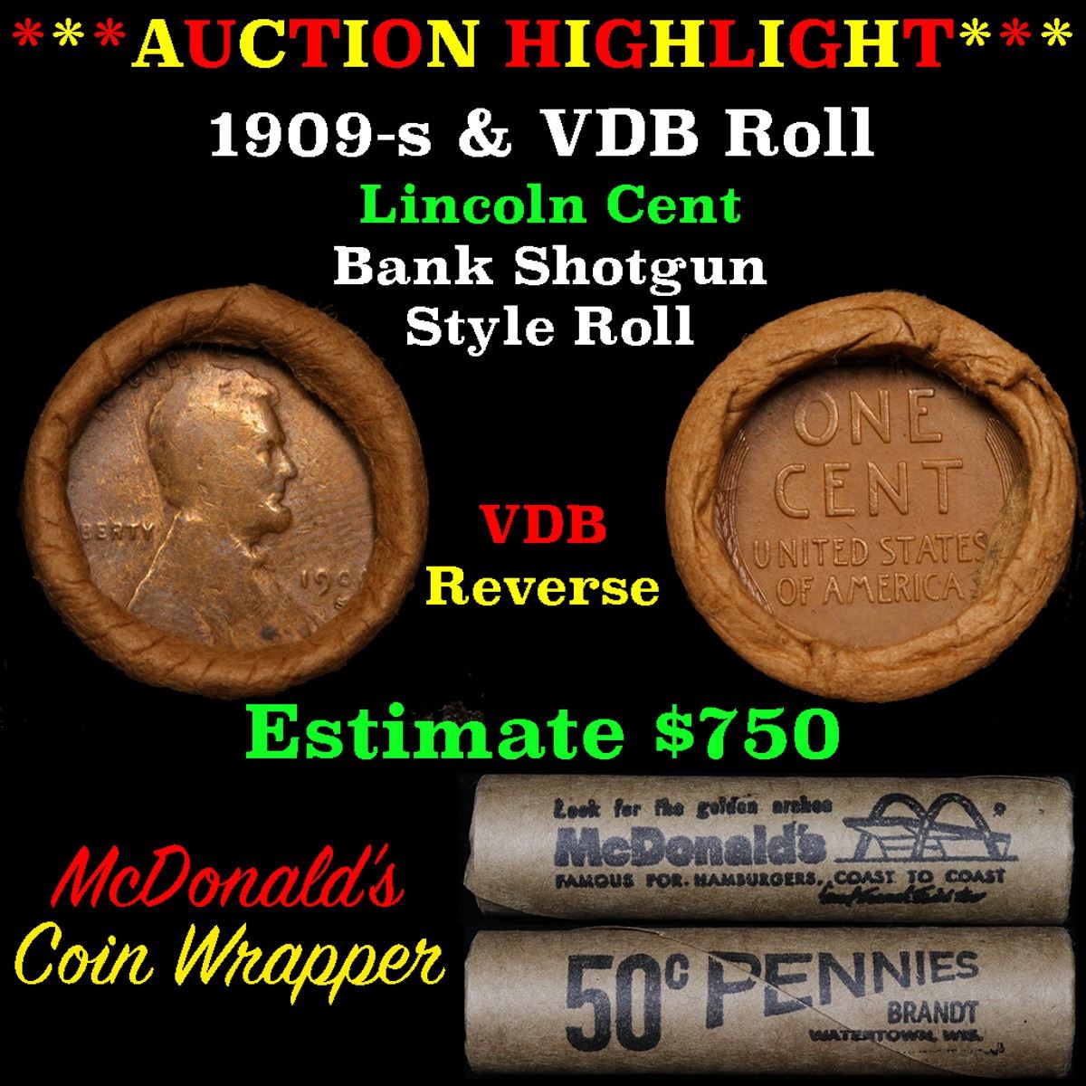 ***Auction Highlight*** Lincoln Wheat cent 1c orig roll, 1909-s end, VDB other end, WOW! (fc). Lincoln Wheat cent 1c original Shotgun Roll, Key date 1909-s on one end, VDB reverse on the other. The roll is held in a Rare & Collectable McDonalds Brandt wrapper. Actual roll pictured is the roll you will get. A great original bank shotgun roll with very tight ends. From the feedback we have been receiving, people are happy with these rolls, nearly half the roll seems to be teens, all the rolls have a few Indians, most of the rolls have some steel cents, and a lot of the wheaties are mintmarks. These shotgun rolls are all from a new consignee. They are all frrom one Estate. This particular Roll shows a 1909-s on one end and a VDB reverse on the other end.