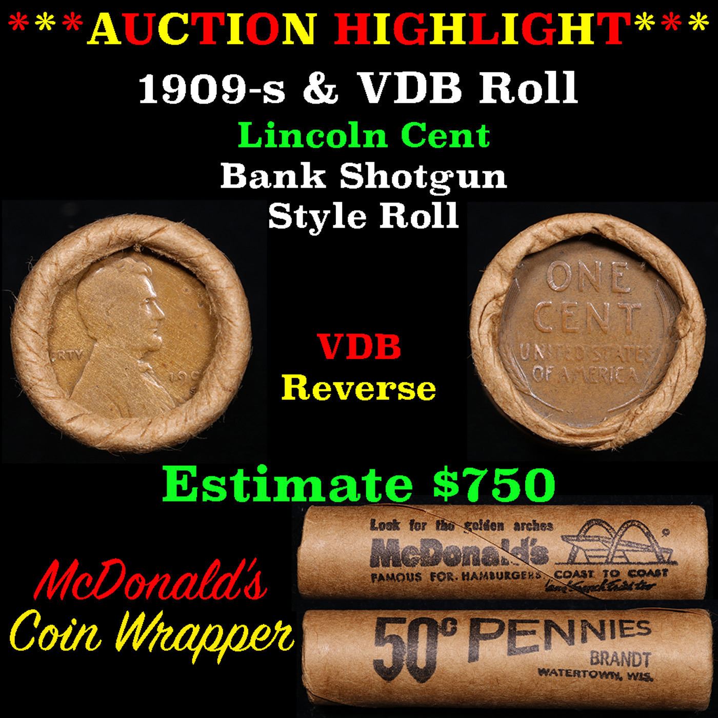 ***Auction Highlight*** Lincoln Wheat cent 1c orig roll, 1909-s end, VDB other end. Lincoln Wheat cent 1c original Shotgun Roll, 1909-s on one end, VDB reverse on the other. The roll is held in a Rare & Collectable McDonalds Brandt wrapper. Actual roll pictured is the roll you will get. A great original bank shotgun roll with very tight ends. From the feedback we have been receiving, people are happy with these rolls, nearly half the roll seems to be teens, all the rolls have a few Indians, most of the rolls have some steel cents, and a lot of the wheaties are mintmarks. These shotgun rolls are all from a new consignee. They are all frrom one Estate. This particular Roll shows a 1909-s on one end and a VDB reverse on the other end.