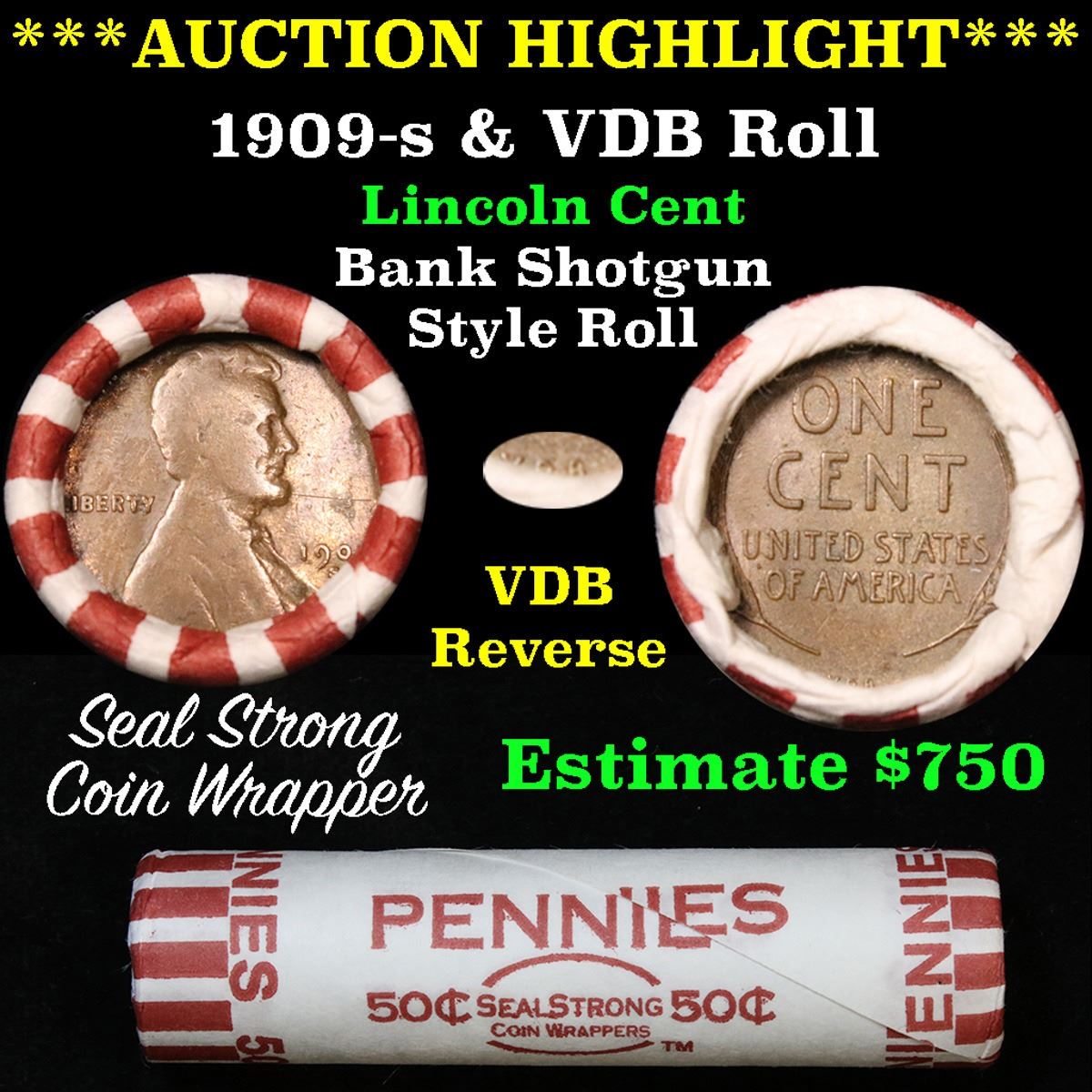 *Auction Highlight* Lincoln Wheat cent 1c orig roll, 1909-s on one end, VDB rev other end, WOW! . .. Lincoln Wheat cent 1c original Shotgun Roll, Key date 1909-s on one end, VDB reverse on the other. The roll is held in a Seal Strong wrapper. Actual roll pictured is the roll you will get. A great original bank shotgun roll with very tight ends. From the feedback we have been receiving, people are happy with these rolls, nearly half the roll seems to be teens, all the rolls have a few Indians, most of the rolls have some steel cents, and a lot of the wheaties are mintmarks. These shotgun rolls are all from a new consignee. They are all from one Estate. This particular Roll shows a 1909-s on one end and a VDB reverse on the other end.