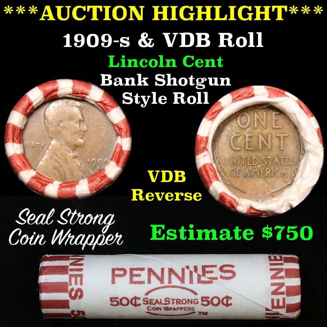 ***Auction Highlight*** Lincoln Wheat cent 1c orig roll, 1909-s on one end, VDB rev other end, WOW!. Lincoln Wheat cent 1c original Shotgun Roll, Key date 1909-s on one end, VDB reverse on the other. The roll is held in a Seal Strong wrapper. Actual roll pictured is the roll you will get. A great original bank shotgun roll with very tight ends. From the feedback we have been receiving, people are happy with these rolls, nearly half the roll seems to be teens, all the rolls have a few Indians, most of the rolls have some steel cents, and a lot of the wheaties are mintmarks. These shotgun rolls are all from a new consignee. They are all frrom one Estate. This particular Roll shows a 1909-s on one end and a VDB reverse on the other end.