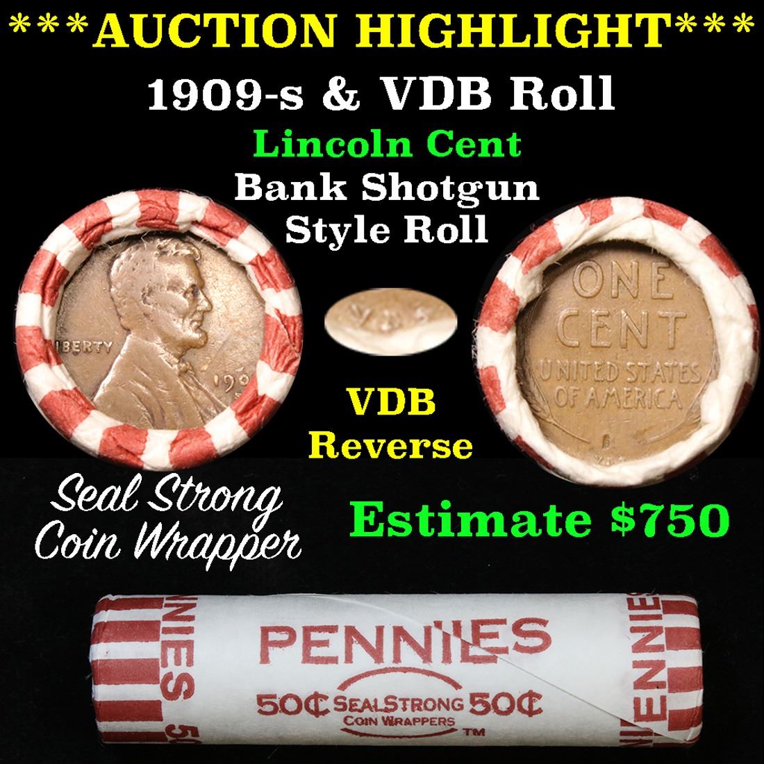 ***Auction Highlight*** Lincoln Wheat cent 1c orig roll, 1909-s on one end, VDB rev other end, WOW!. Lincoln Wheat cent 1c original Shotgun Roll, Key date 1909-s on one end, VDB reverse on the other. The roll is held in a Seal Strong wrapper. Actual roll pictured is the roll you will get. A great original bank shotgun roll with very tight ends. From the feedback we have been receiving, people are happy with these rolls, nearly half the roll seems to be teens, all the rolls have a few Indians, most of the rolls have some steel cents, and a lot of the wheaties are mintmarks. These shotgun rolls are all from a new consignee. They are all frrom one Estate. This particular Roll shows a 1909-s on one end and a VDB reverse on the other end.