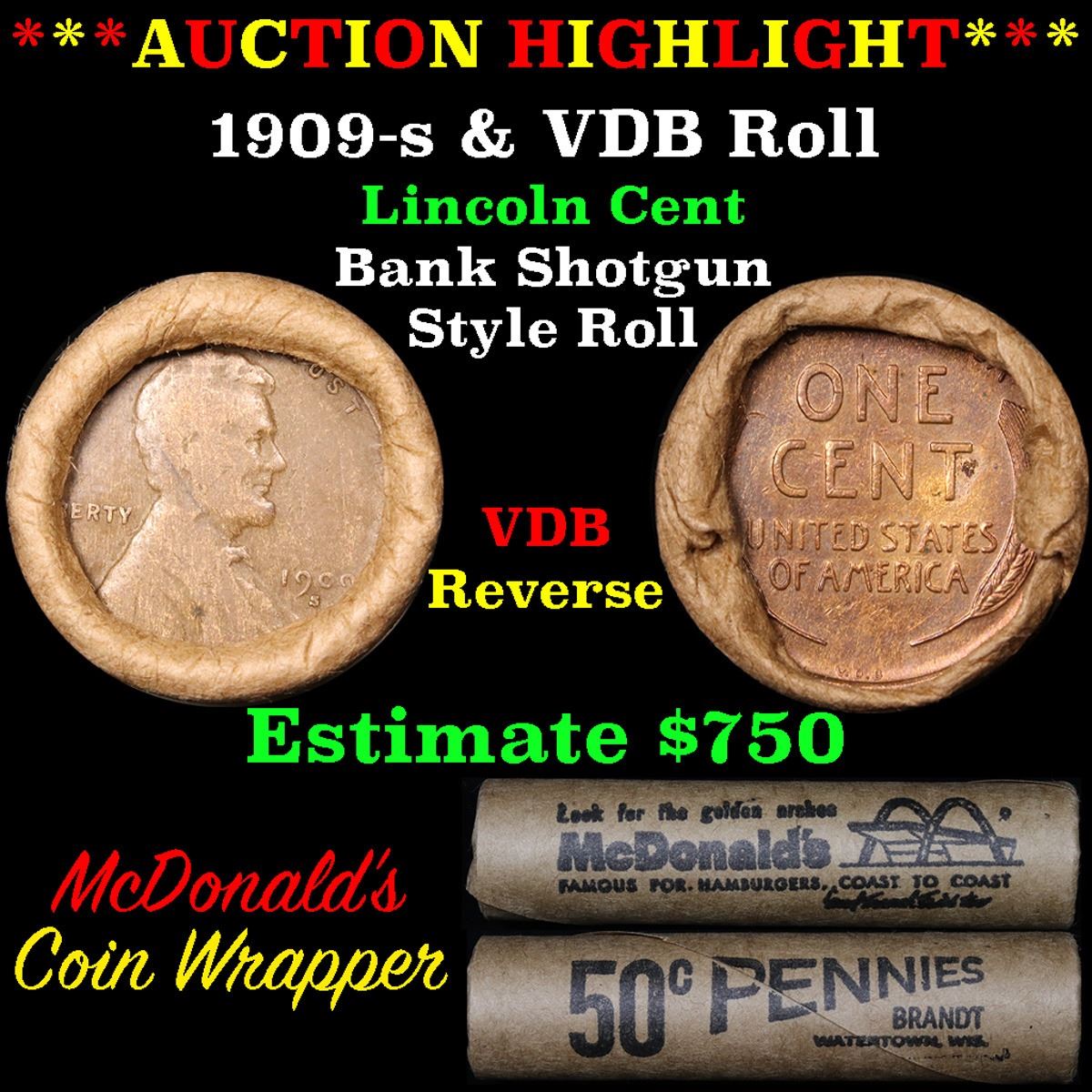 **Auction Highlight** Lincoln Wheat cent 1c orig roll, 1909-s one end, VDB rev other end, WOW! The Roll is in an Mcdonalds Collectible Brandt Wrapper'. A great bank style shotgun roll of Indian cents 1c with very tight ends. We have not had much feedback yet, but from what we have been told, the rolls appear to be filled with a mixture of 1800's and 1900's. These shotgun rolls are all from a new consignee. They are all frrom one Estate. This particular Roll shows an 1909 on one end and a KEY date 's' mint on the reverse WOW!.