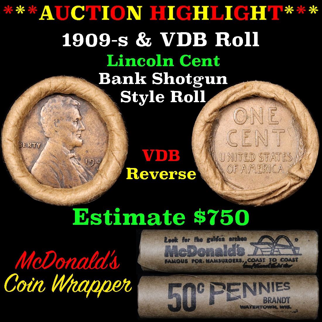 **Auction Highlight** Lincoln Wheat cent 1c orig roll, 1909-s one end, VDB rev other end, WOW!. The Roll is in an old Rare & Collectible McDonalds Brandt Wrapper'. A great bank style shotgun roll of Indian cents 1c with very tight ends. We have not had much feedback yet, but from what we have been told, the rolls appear to be filled with a mixture of 1800's and 1900's. These shotgun rolls are all from a new consignee. They are all frrom one Estate. This particular Roll shows an 1909 on one end and a KEY date 's' mint on the reverse WOW!.