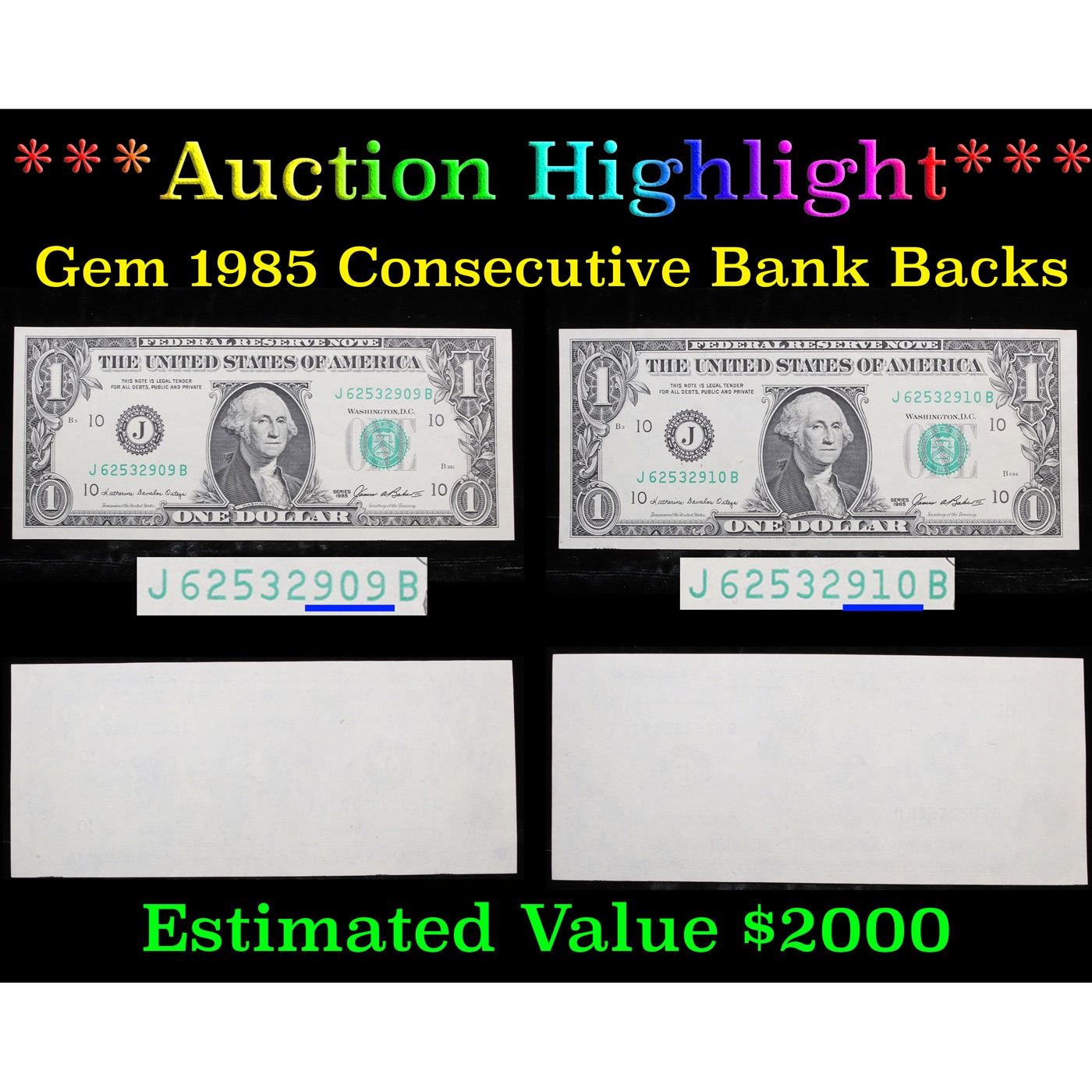 ***Auction Highlight*** MINT ERROR 1985 $1 Green Seal FRN w/ Blank Backs, Consecutive Serial Numbers 2 Bills Ultra Rare Grades Gem CU.        ***ULTRA RARE*** ***MINT ERROR*** 1985 $1 Green Seal Federal Reserve Notes w/ Blank Backs, 2 Bills with Consecutive Serial Numbers. To properly qualify as a missing printing error the note must have completely failed to receive any portion of the intended design at the skipped printing stage.  Notes which demonstrate even the tiniest portion of the design originate from an alternate etiology and are not classified as missing printings.  There are three distinct causes for a missing printing error.  Most commonly, two uncut sheets of currency stock enter the printing press simultaneously with one atop the other.  The uppermost sheet accepts the imprint normally while the lower sheet-because it is protected by the top layer-passes through blank.  Less frequently, an entire stack of sheets is advanced to subsequent printing and/or cutting operations after skipping a printing stage. Alternate causes of the error are the press operator shutting down the presses in the middle of a run or the printing plates contracting the currency paper and retracting prematurely. Not only did this happen to theese notes but they would have had to of been right next to each other and gotten out of the mint like that which is why they are consecutive seral numbers. Estimated Value $2000
