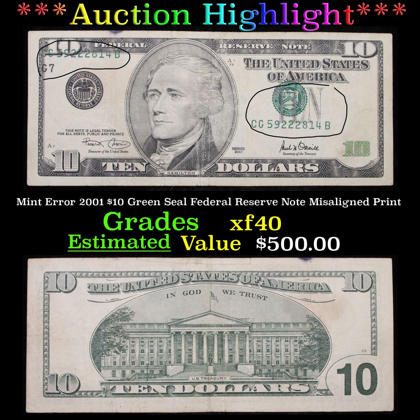 ***Auction Highlight*** Mint Error 2001 $10 Green Seal Federal Reserve Note Misaligned Print Grades