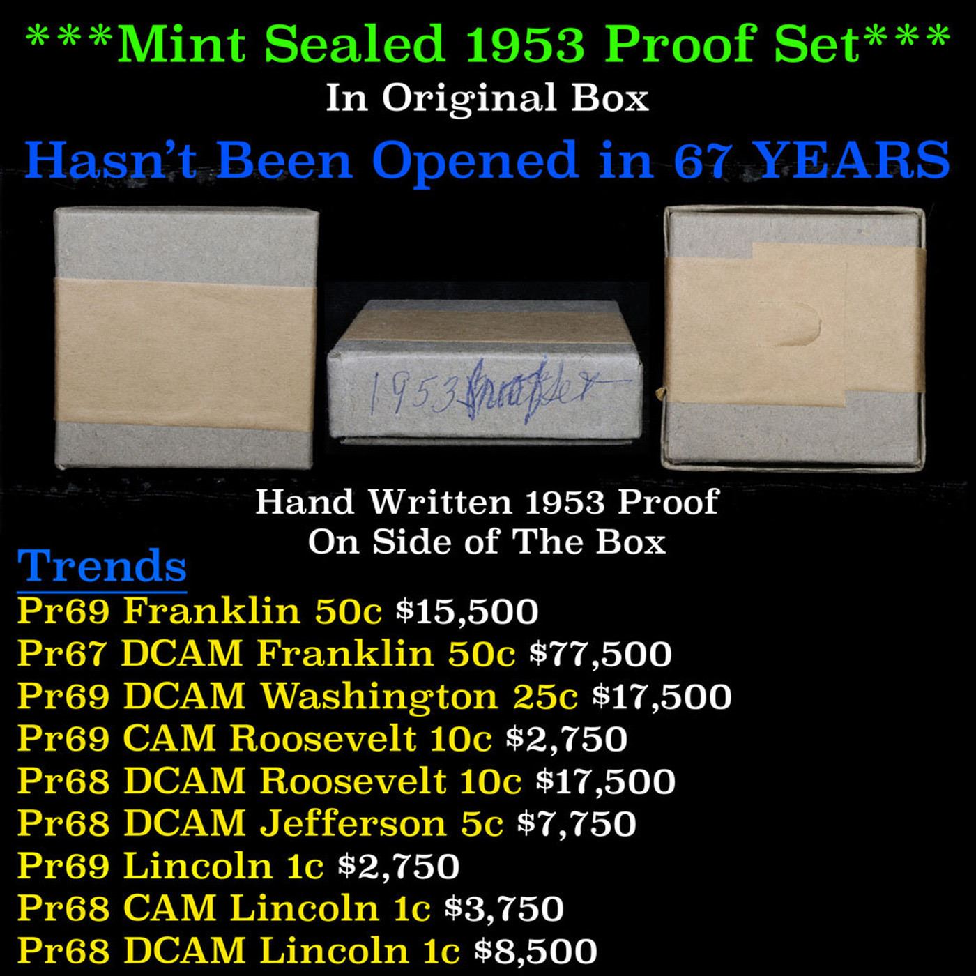 ***Auction Highlight*** Mint Sealed Unopened 1953 Proof Set In Original Box Not Opened For 63 Years. A SEALED 1953 Proof Set! with a possibility of proof coins with high grades. This proof set is in the original mint packaging with the original box And Has Not Been Opened in over 60 Years WOW!. This is the boxed variety not the "flat pack". This set contains a proof Silver Franklin half (Trends pr69 $15,500 pr67 dcam Value $77,500), a Proof Silver Washington quarter (pr69 dcam $17,500), the proof Silver Roosevelt dime (Trends pr69 cam Value $2,750, pr68 DCAM $17,500 ) + the proof nickel (pr68 dcam Value $7,750) and the proof penny (Trends: pr69 $2,750, pr68 Cam $3,750, pr68 dcam Value $8,500).