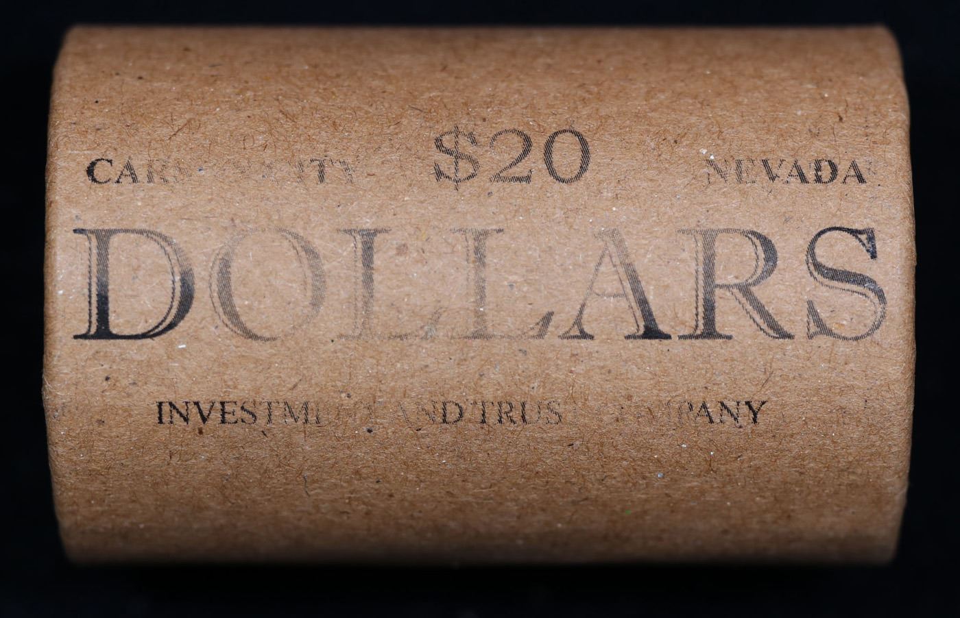 ***Auction Highlight*** Mixed Morgan/Peace Circ silver dollar roll, 20 coin 1896 & 'S' Ends. This roll is held in an old Carson City, Nevada Investment and Trust Co Wrapper with Tight Shotgun Ends. This roll contains 20, Morgan/Peace silver Dollars. The coins may range from circulated to uncirculated. Any condition is possible. We have weighed the roll and can assure you that it is 20 Silver Dollars, that all 20 are Morgan/Peace Dollars and that it is not an uncirculated roll as the weight comes in slightly under the 536.7 grams that a fully uncirculated roll would weigh. We recently Acquired a large Estate Hoard of Carson City Mixed Rolls.