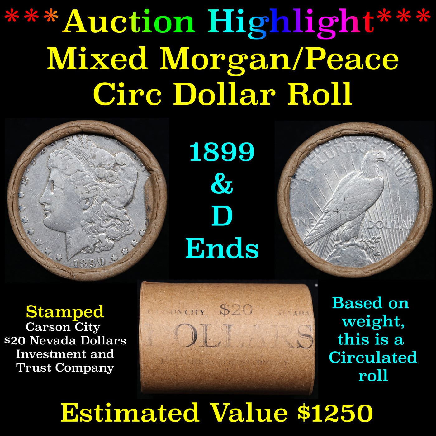 ***Auction Highlight*** Mixed Morgan/Peace Circ silver dollar roll, 20 coin 1899 & 'D' Ends (fc)