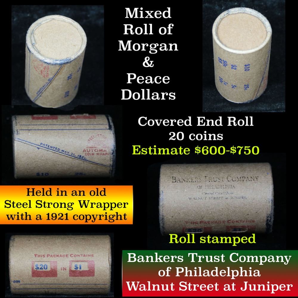 ***Auction Highlight*** Morgan & Peace $1 Mixed Roll Steel Strong Shotgun Wrapper w/Covered Ends. Great Original Roll of Morgan & Peace Dollars. The Two ends are covered.ÊAny dates & any condition possible inside. Note you will receive a roll completely similar to the photo. We have a large hoard of these rolls & they all look exactly alike. We have had great feedback on the rolls so far.Ê Some lucky bidders have gotten key dates & PL's. The roll is held in an old "Steel Strong Automatic" Wrapper Dated from 1921. The Roll is also faintly stamped "Banker Trust of Philadelphia, Central City Office, Walnut Street at Juniper". I researched that name and the Bank closed in the post-Crash of '29 Depression period (my research showed that it failed on Dec 22, 1930). We received this incredible consignment from a private collector. The consignee gave us his father's entire estate hoard of shotgun rolled coins.