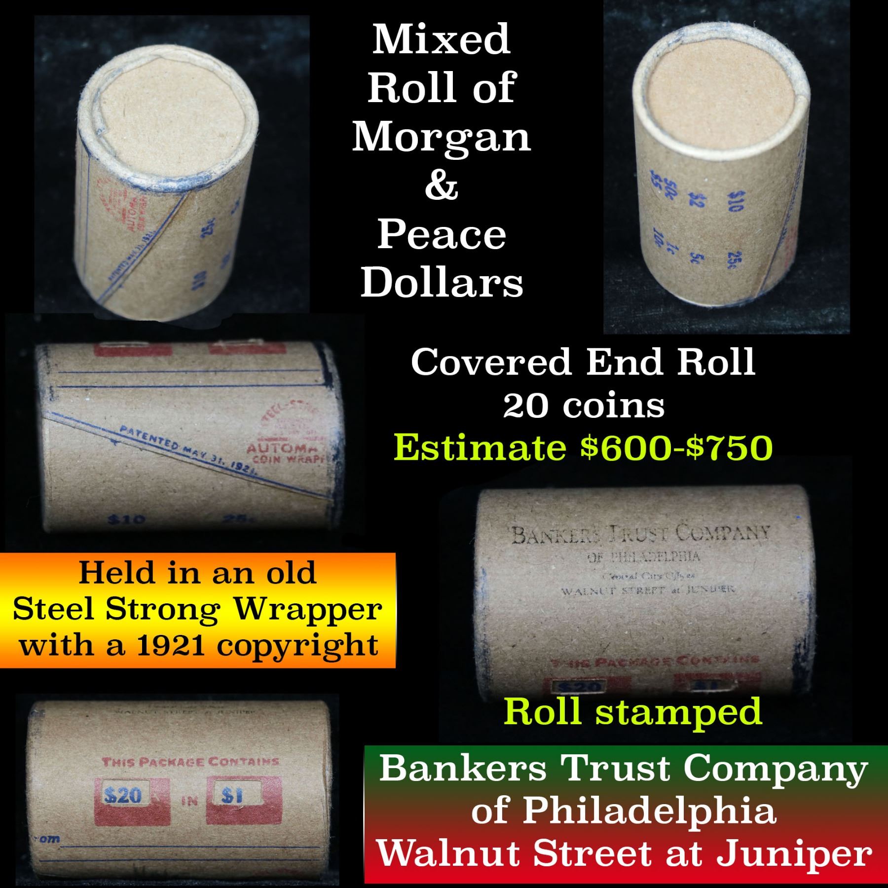 ***Auction Highlight*** Morgan/Peace $1 Mixed Roll Steel Strong Shotgun Wrapper w/Covered Ends. Great Original Roll of Morgan & Peace Dollars. The Two ends are covered.ÊAny dates & any condition possible inside. Note you will receive a roll completely similar to the photo. We have a large hoard of these rolls & they all look exactly alike. We have had great feedback on the rolls so far.Ê Some lucky bidders have gotten key dates & PL's. The roll is held in an old "Steel Strong Automatic" Wrapper Dated from 1921. The Roll is also faintly stamped "Banker Trust of Philadelphia, Central City Office, Walnut Street at Juniper". I researched that name and the Bank closed in the post-Crash of '29 Depression period (my research showed that it failed on Dec 22, 1930). We received this incredible consignment from a private collector. The consignee gave us his father's entire estate hoard of shotgun rolled coins.