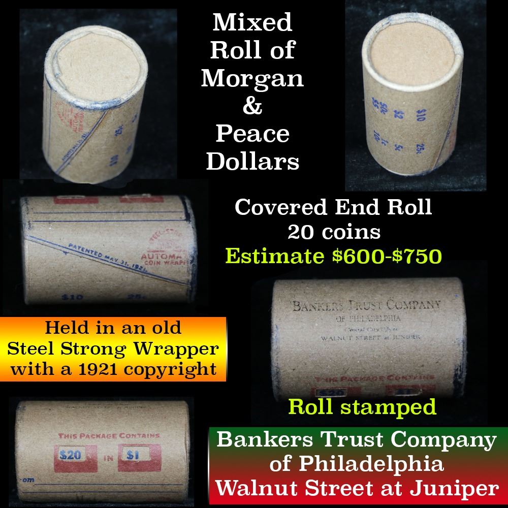 ***Auction Highlight*** Morgan/Peace $1 Mixed Roll Steel Strong Shotgun Wrapper w/Covered Ends. Great Original Roll of Morgan & Peace Dollars. The Two ends are covered.ÊAny dates & any condition possible inside. Note you will receive a roll completely similar to the photo. We have a large hoard of these rolls & they all look exactly alike. We have had great feedback on the rolls so far.Ê Some lucky bidders have gotten key dates & PL's. The roll is held in an old "Steel Strong Automatic" Wrapper Dated from 1921. The Roll is also faintly stamped "Banker Trust of Philadelphia, Central City Office, Walnut Street at Juniper". I researched that name and the Bank closed in the post-Crash of '29 Depression period (my research showed that it failed on Dec 22, 1930). We received this incredible consignment from a private collector. The consignee gave us his father's entire estate hoard of shotgun rolled coins.