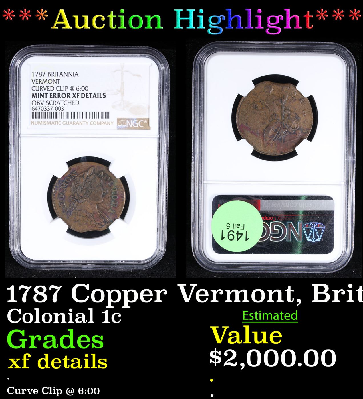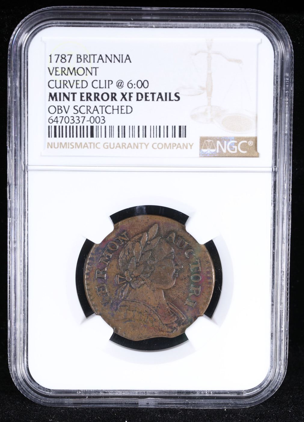 ***Auction Highlight*** NGC 1787 Copper Vermont, Britannia Colonial Cent Mint Error 1c Graded xf det