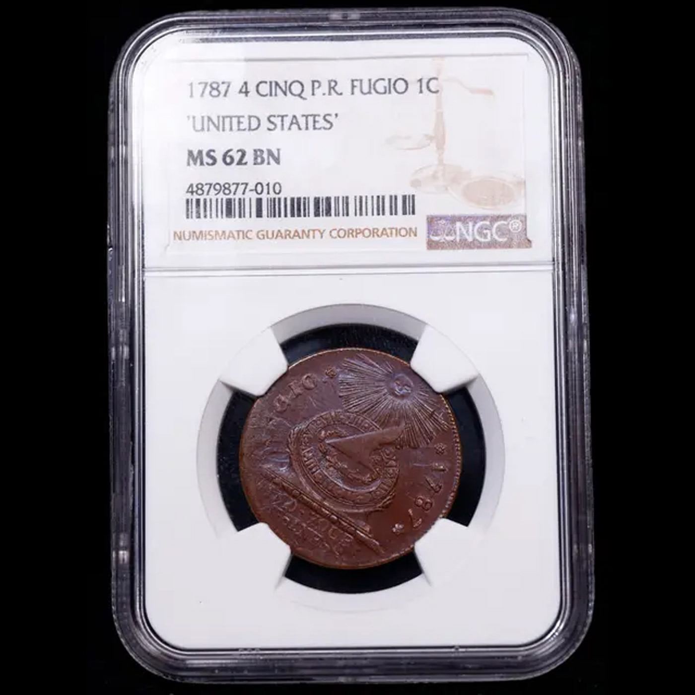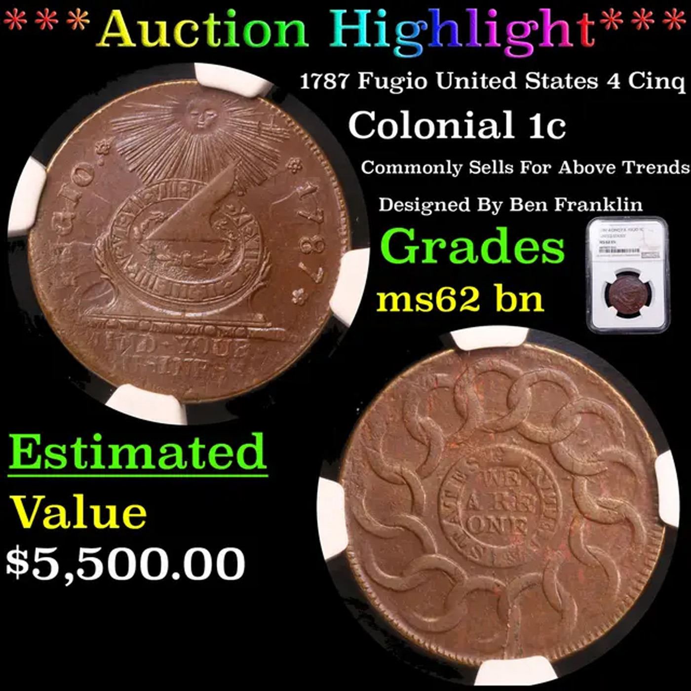 ***Auction Highlight*** NGC 1787 Fugio United States 4 Cinq Colonial Cent 1c Grades ms62 bn BY NGC. A Key Date's Pick, Bid to Win, Don't let it get Away, you might not find its equal Coin