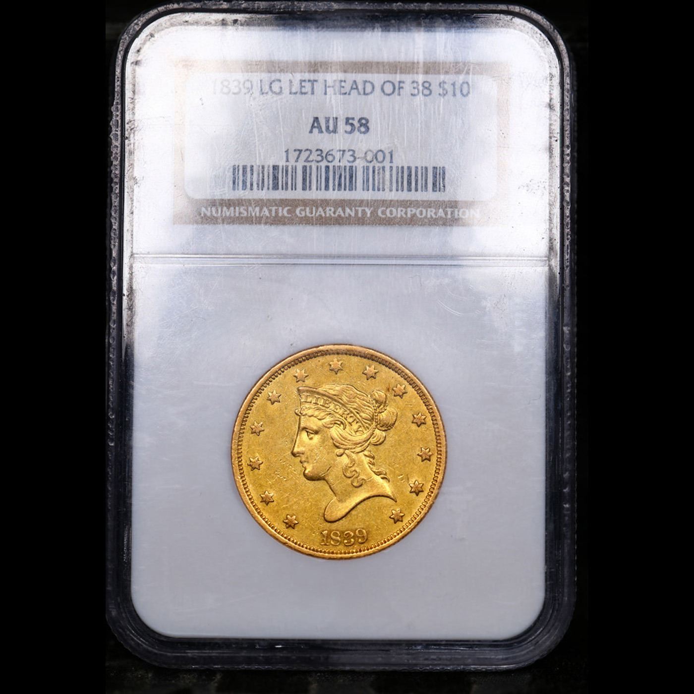 ***Auction Highlight*** NGC 1839/8 Type of 38 Gold Liberty Eagle $10 Graded au58 BY NGC. Offered is an exceedingly rare coin, one of the finest known Liberty Head eagles of the brief and challenging Type of 1838 design. The entire coin displays vivid reddish-gold patina, The design elements in the centers are fully rendered, and the surfaces are very nice for the assigned grade. A beautiful and very rare $10 gold coin that will appeal to both advanced gold type collectors and Liberty Head eagle enthusiasts.The longest-running $10 gold eagle series produced in the United States Mint, the Liberty Head eagle was struck without interruption from 1838 through early 1907. It is the first eagle produced since 1804, President Thomas Jefferson having halted production of both this denomination and the silver dollar that year as rising bullion prices made the coins highly susceptible to melting by speculators. From 1805 through 1837, the largest gold denomination that the United States Mint produced was the $5 half eagle. By 1838, however, two laws had been passed that made it possible for the Mint to resume eagle coinage. The first was the Act of June 28, 1834, which reduced the weight of standard U.S. gold coins and, in so doing, placed the nation's monetary system on a gold standard. The second was the Act of January 18, 1837, a general overhaul of the nation's coinage laws that, among other things, standardized the fineness of gold and silver coins at 900 thousandths.When eagle production finally resumed in 1838, the Mint settled upon the Liberty Head design of Christian Gobrecht, featuring a portrait of Liberty facing left, her hair tied in a bun at the back of her head and wearing a coronet inscribed LIBERTY. 13 stars encircle the border, and the date is below the portrait. The initial portrait utilized in 1838 and early 1839 had deeper curvature to the truncation of the bust with Liberty's hair pulled back over her ear. The design was modified slightly in 1839 to create the Liberty Head motif that would remain in use through 1907.The basic reverse design also remained unchanged from 1838 to 1907, featuring an eagle with outstretched wings and a shield on its breast. The eagle clutches a group of three arrows in its left talon and an olive branch in its right talon. The legend UNITED STATES OF AMERICA is around the border and the denomination TEN D. is below the eagle. The reverse was modified in 1866, however, with the addition of the motto IN GOD WE TRUST on a scroll above the eagle. To distinguish them from their No Motto predecessors, the Motto eagles of 1866 to 1907 are known as the Type II Liberty Head design.As above, the first iteration of Christian Gobrecht's new Liberty Head eagle bore a distinctive obverse featuring a sweep of hair completely covering Liberty's ear and a peculiarly deep curve to the bust's truncation. Benjamin West's painting Omnia Vincit Amor ("Love Conquers All") served as Gobrecht's model, even down to the beaded cord and coronet style. The first eagles using this design were struck at the end of 1838, with 7,200 pieces intended for circulation on top of four "specimen" coins presented to Secretary of the Treasury Levi Woodbury. In 1839, the same obverse design was employed for the first 2,801 eagles struck bearing that date before the design was modified.The 1839 Type of 1838 eagle is a very scarce coin in all grades, with perhaps just under 250 examples known, with the vast majority well circulated. In Mint State this issue is a formidable rarity and, as with so many dates in the Liberty Head eagle series, it is also an underrated one A Key Date's Pick, Bid to Win, Don't let it get Away, you might not find its equal Coin. I give this coin my highest recommendation